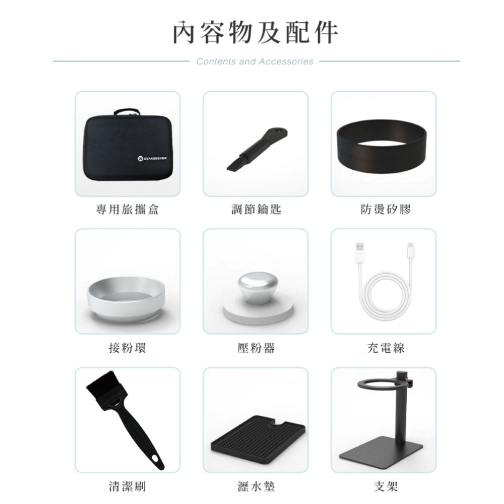 主機,防燙杯(旋轉杯),專用旅攜盒,調節鑰匙,防燙矽膠圈,接粉環,壓粉器,充電線,清潔刷,瀝水墊,專用支架,說明書