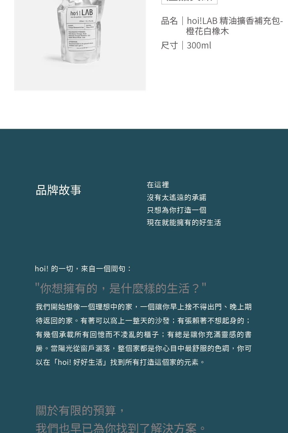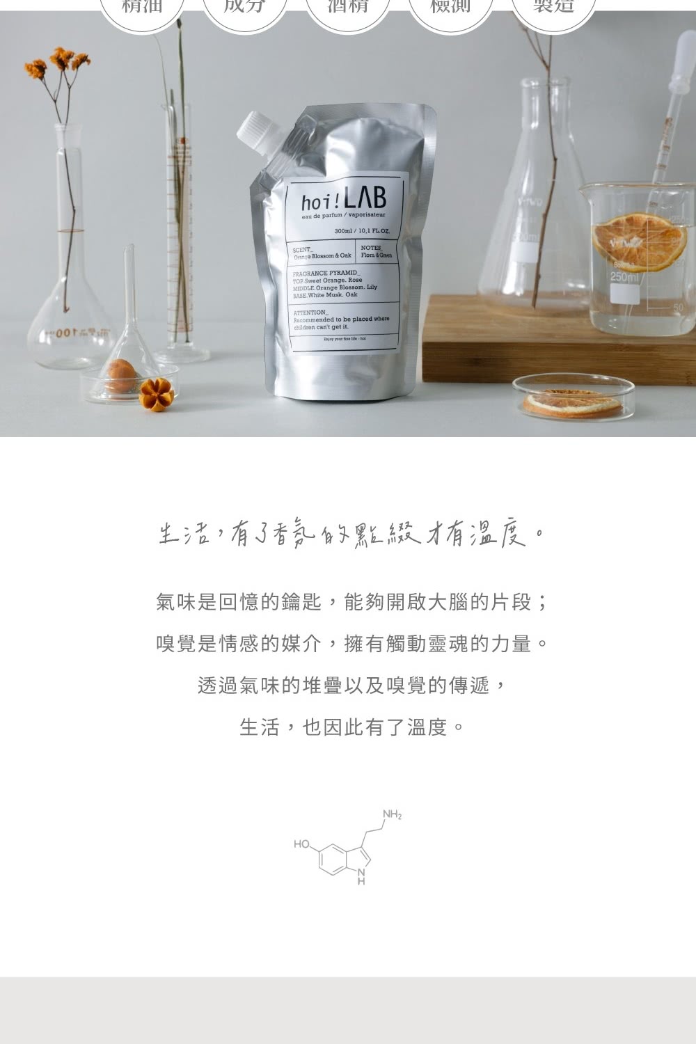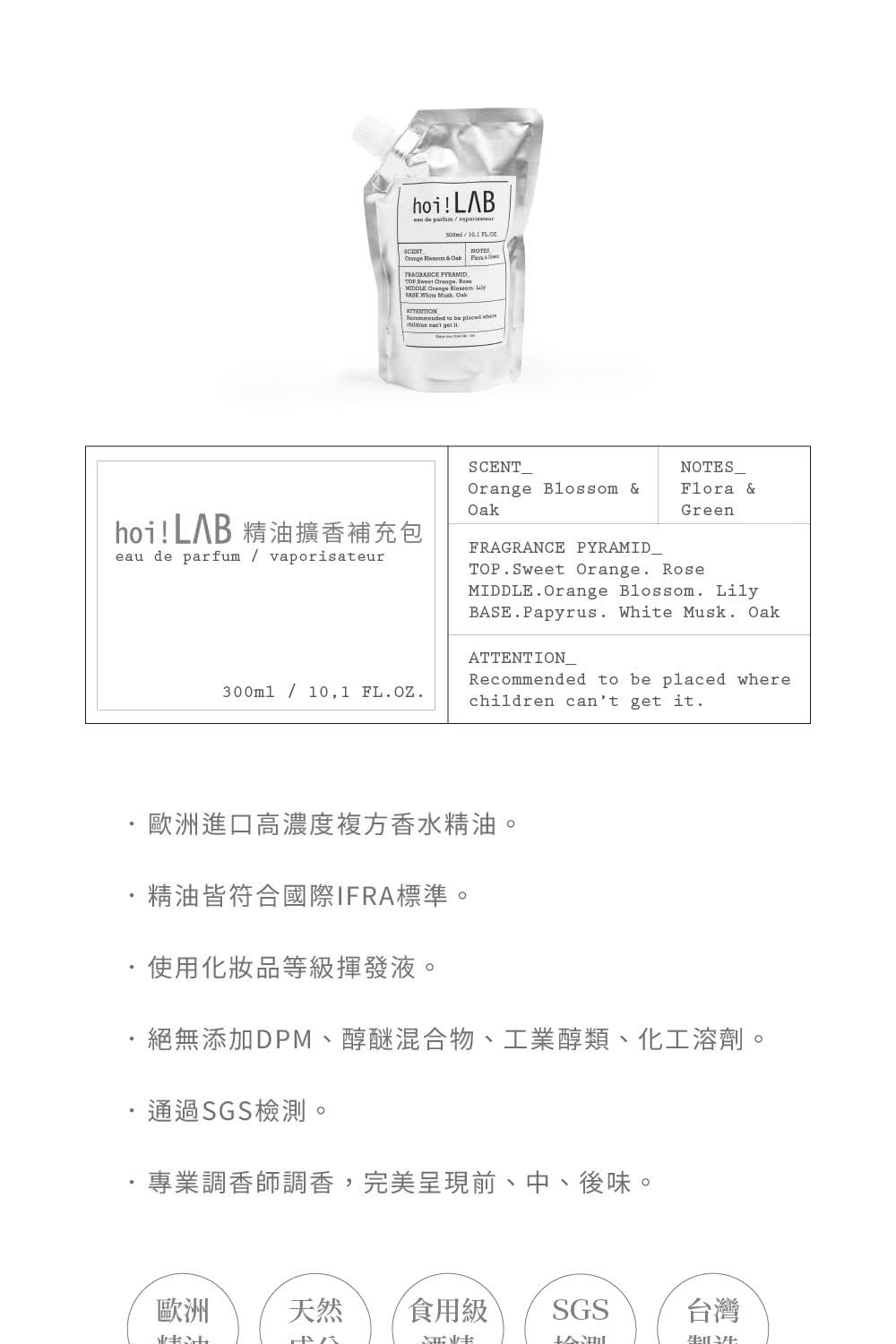 品名: hoi! LAB實驗室 精油擴香補充包300ml 橙花白橡木