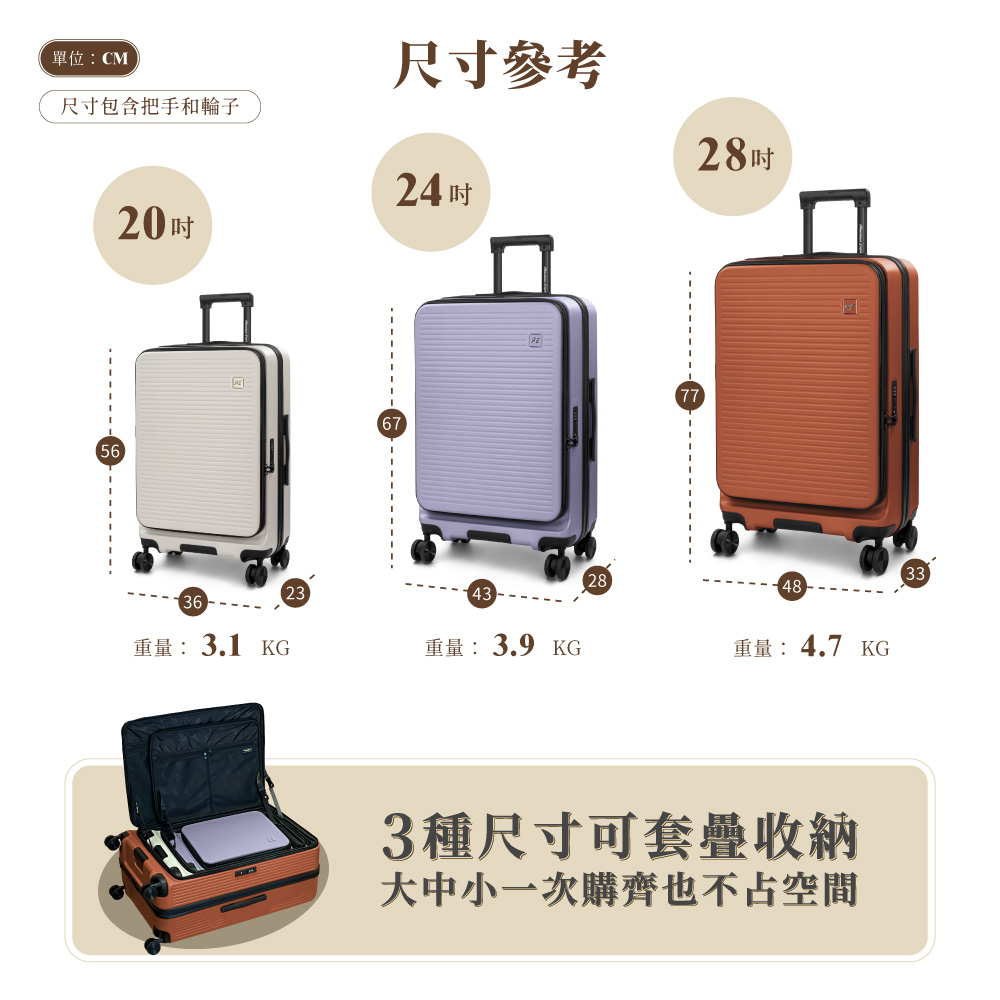 20吋:約為 36 x 23 x 56 cm(含輪)、重量約 3.1 kg