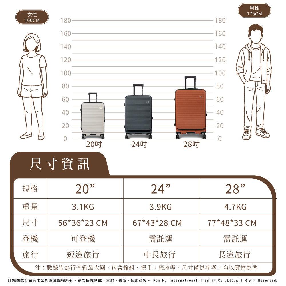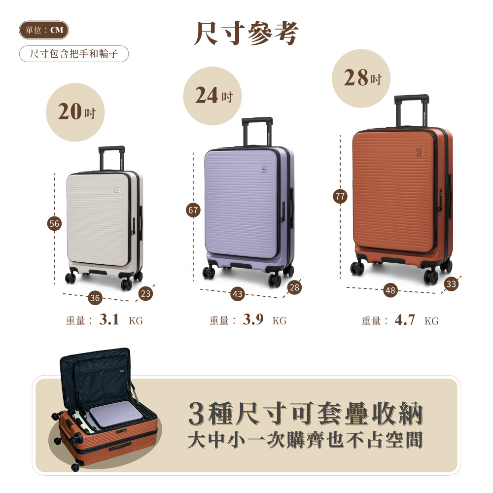 28吋:約為 48 x 33 x 77 cm(含輪)、重量約 4.7 kg
