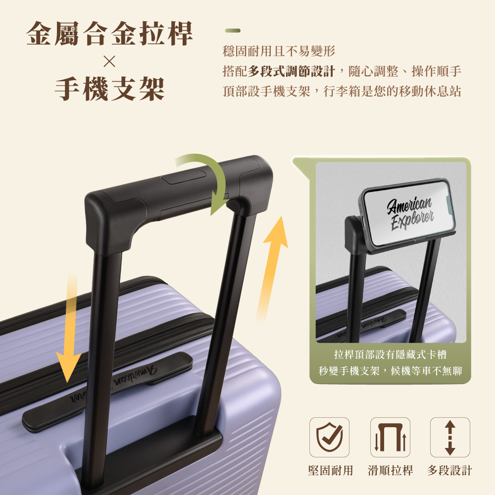 CF62 拉桿:多段式輕量拉桿,可依使用者喜好調整拉桿高度。握把上方附有手機支架,候機等車貼心實用