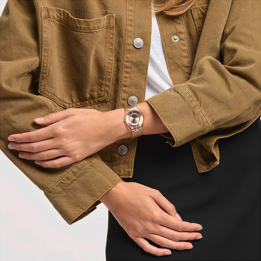 這款超薄腕錶設計選擇太陽放射紋玫瑰金錶盤搭配白色刻度、銀色時針和分針,搭配亮面的透明 Biosourced 生物源材質錶殼和 錶鏡。可調節不鏽鋼網織錶鏈飾以玫瑰金色 PVD 塗層,為腕錶造型增添時尚感。