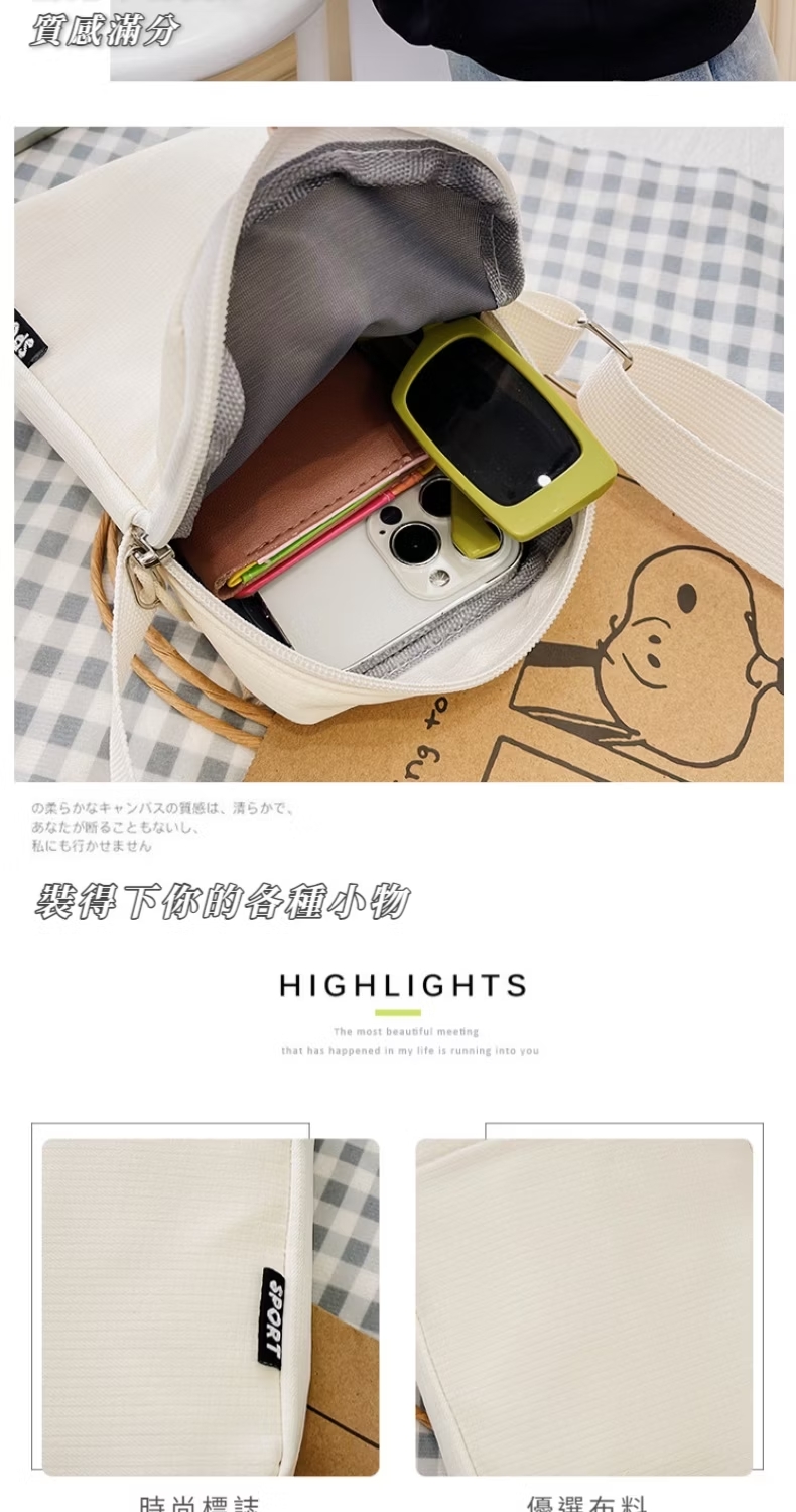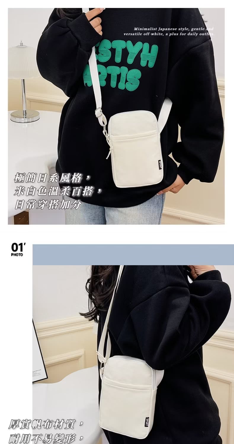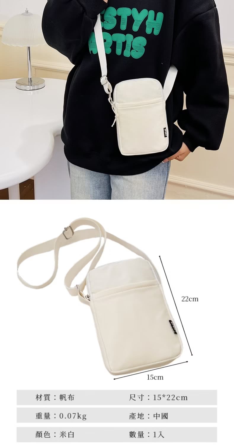 【萬萬裝】雙11 日系米白帆布掛脖單肩小包(大手機可 大容量 隨身外出 斜跨包 零錢包 媽媽包)