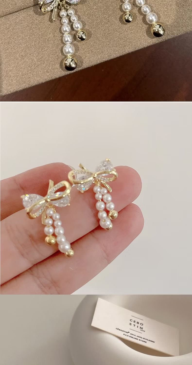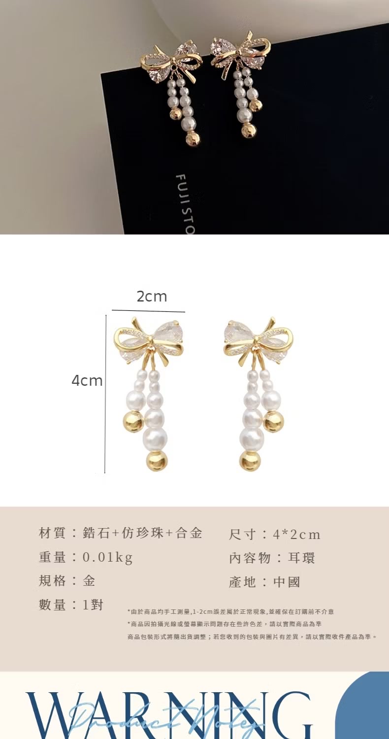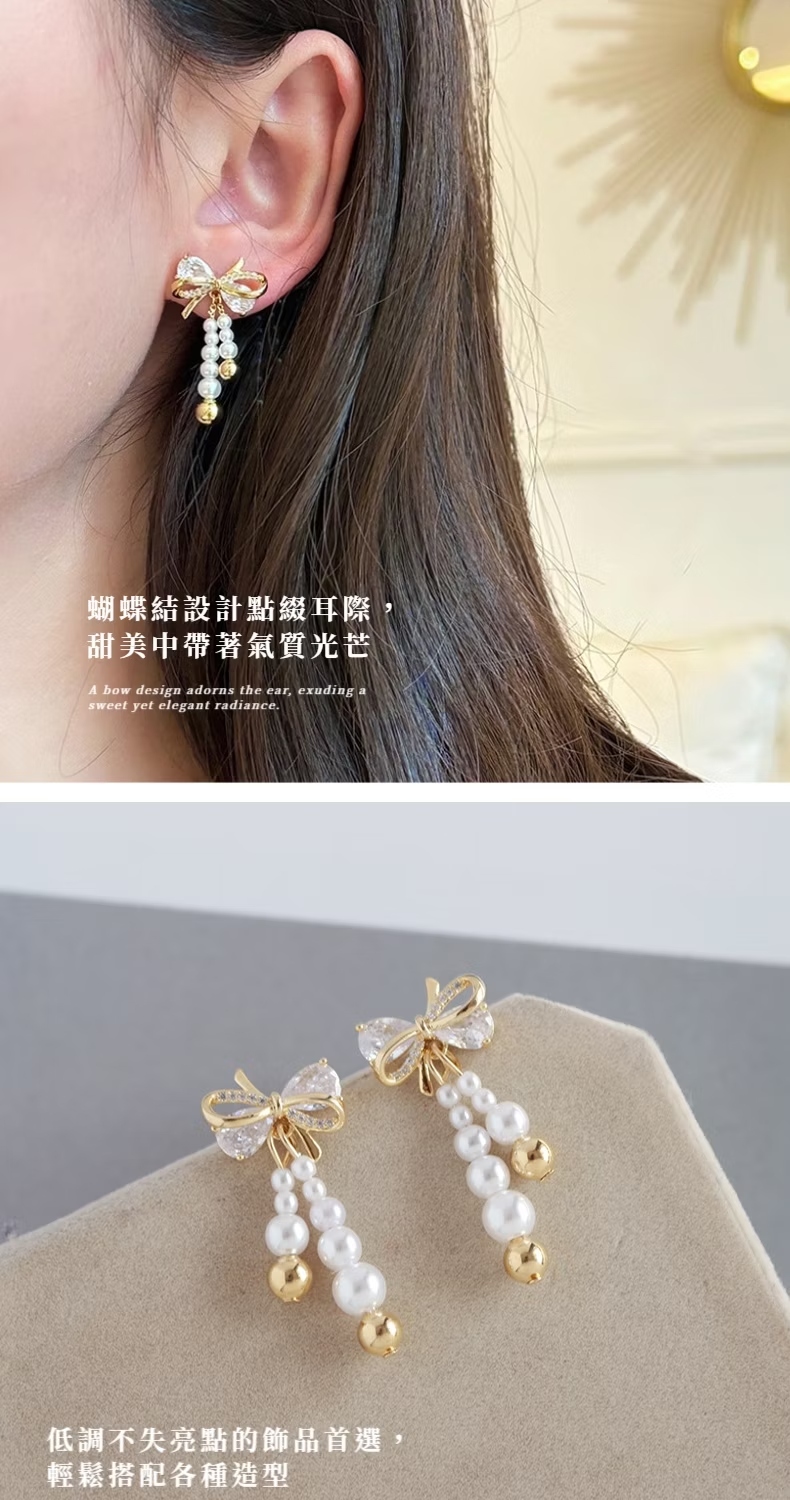【流蘇亮麗】鋯石珍珠蝴蝶結耳環1對(耳飾 耳墜 飾品 耳針 耳釘 首飾 耳圈 情人節 配件 禮物)