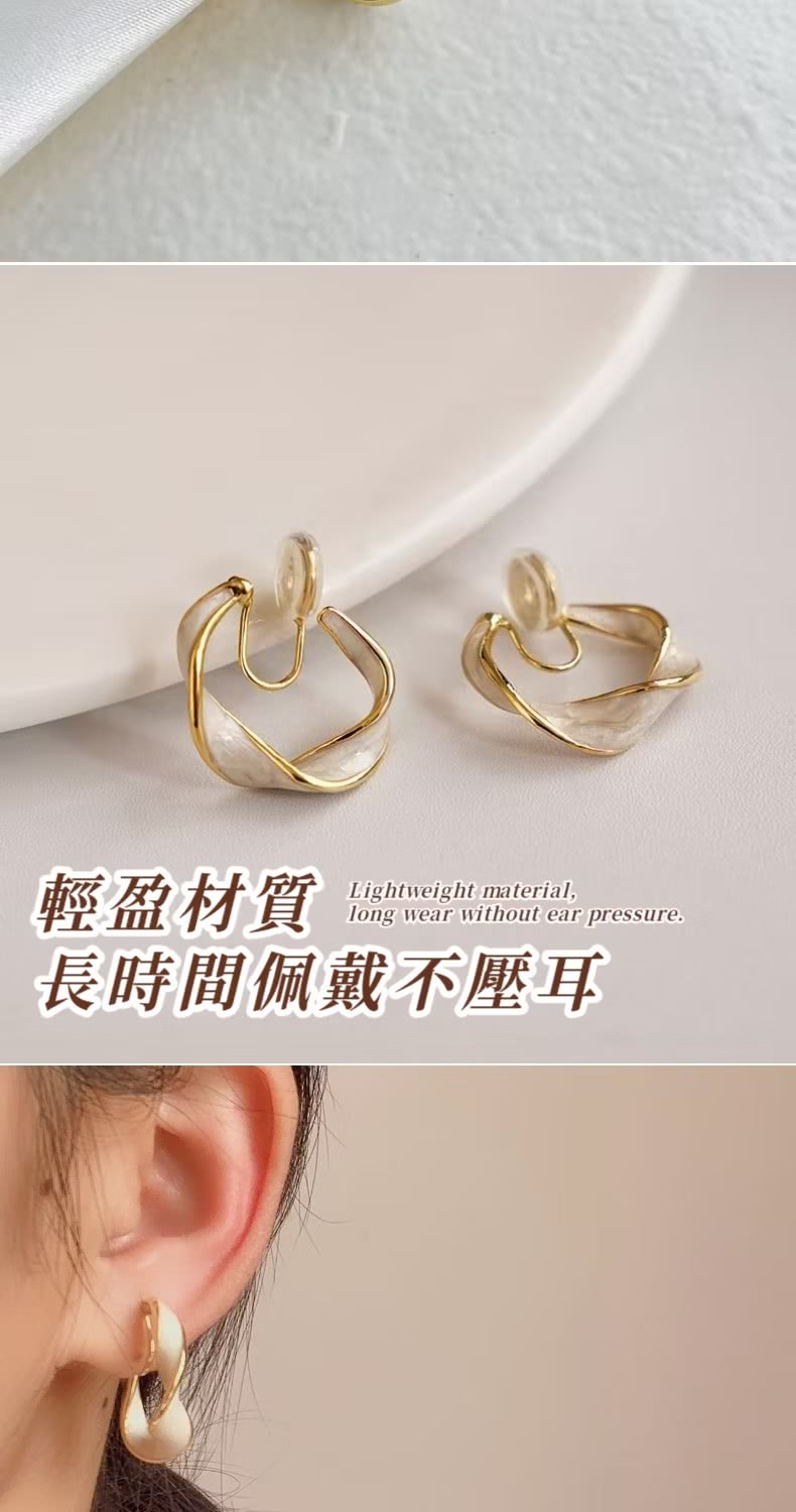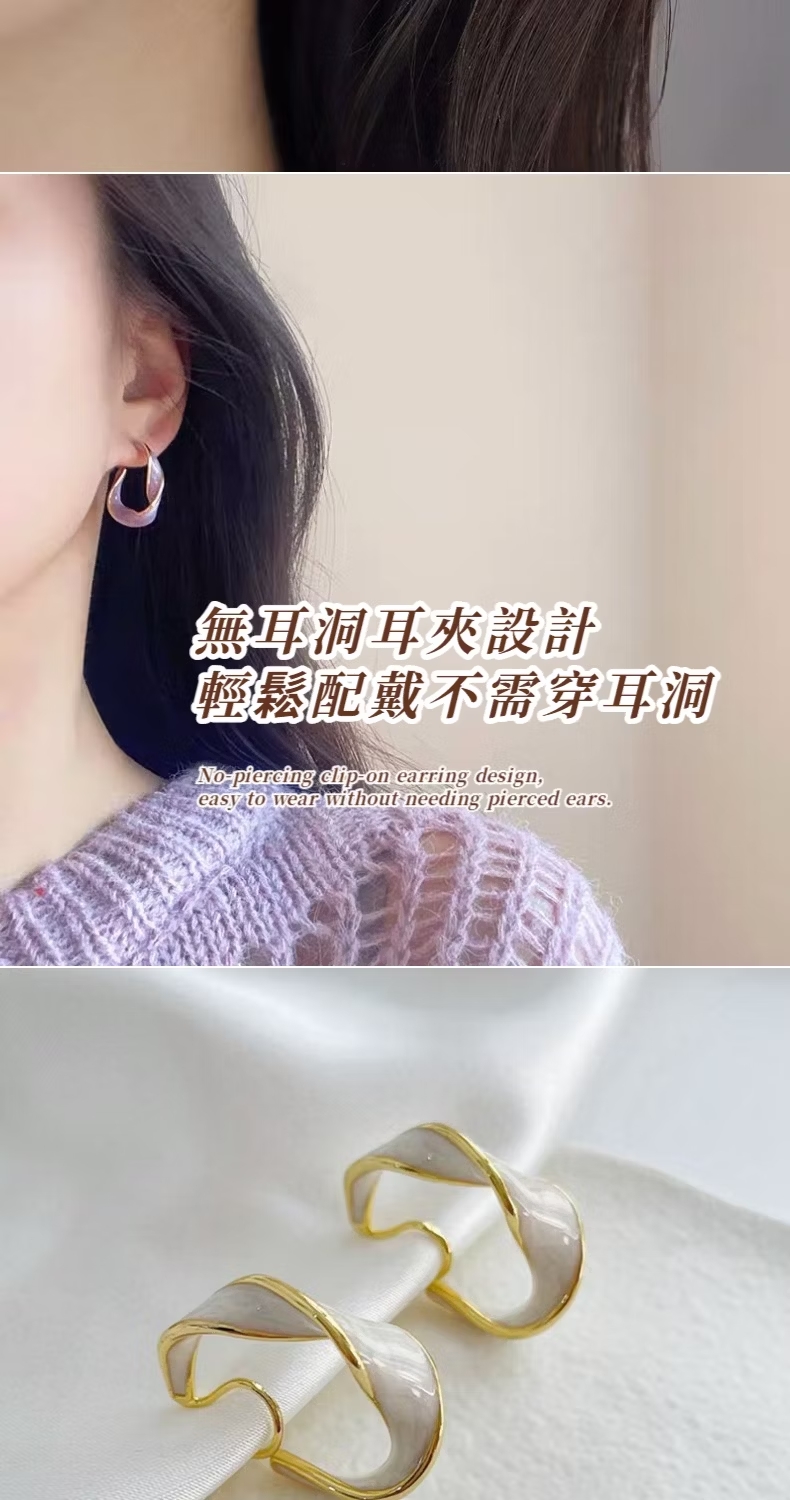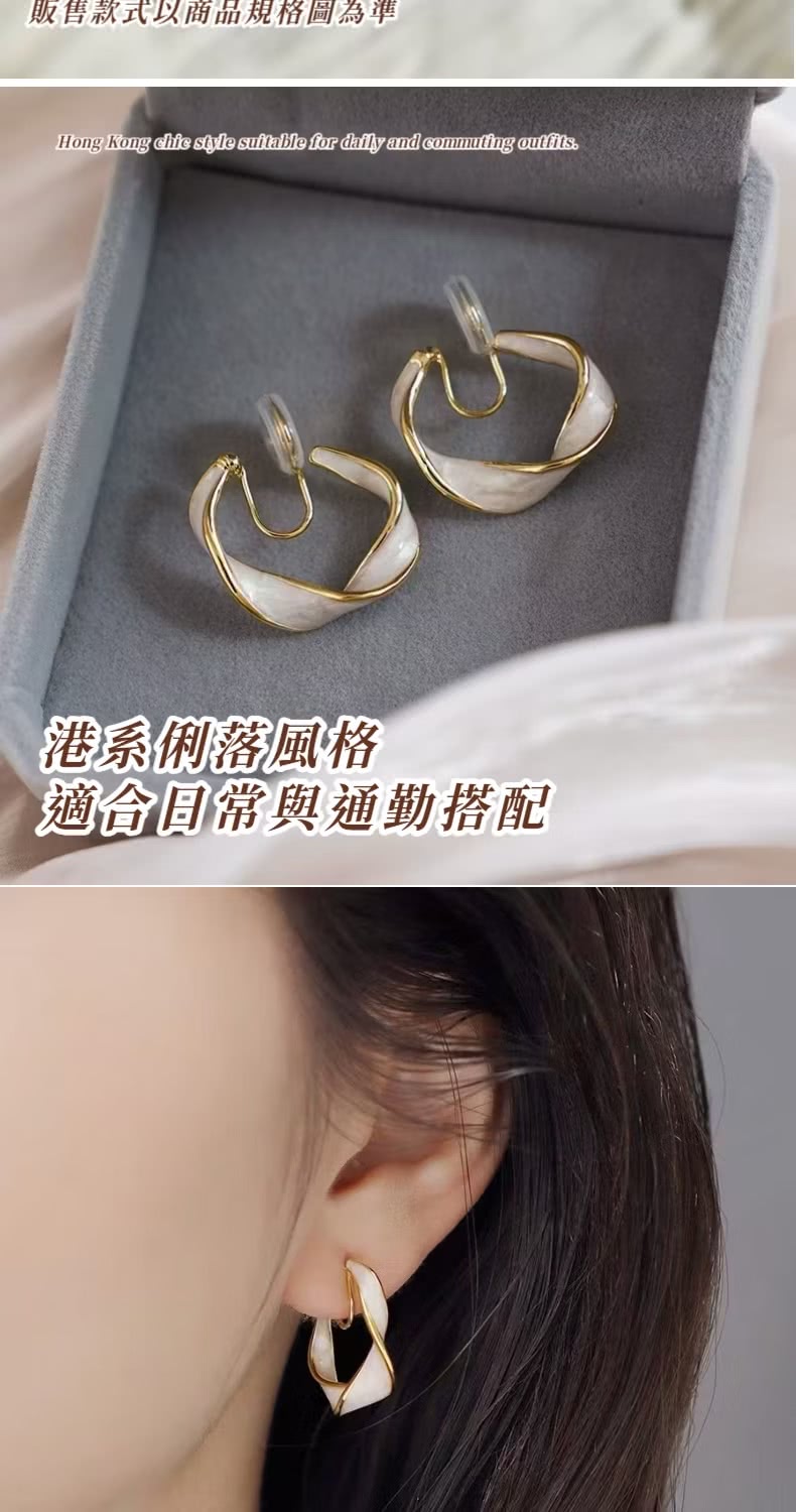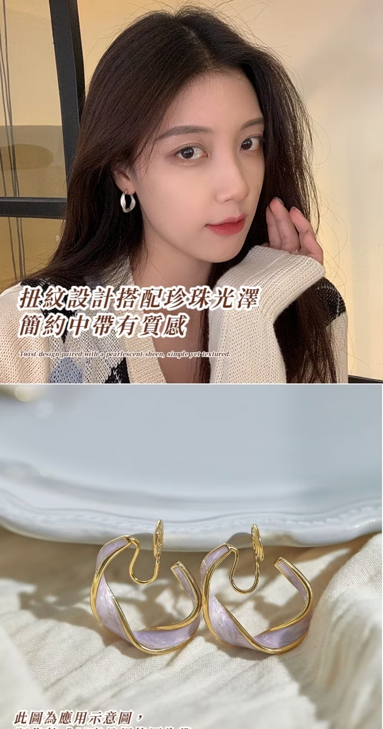 【高級設計感】港系扭紋珍光無耳洞耳環夾(無耳洞 夾式 耳環 耳夾 耳飾 C型 光澤感 約會 日常 圈圈)