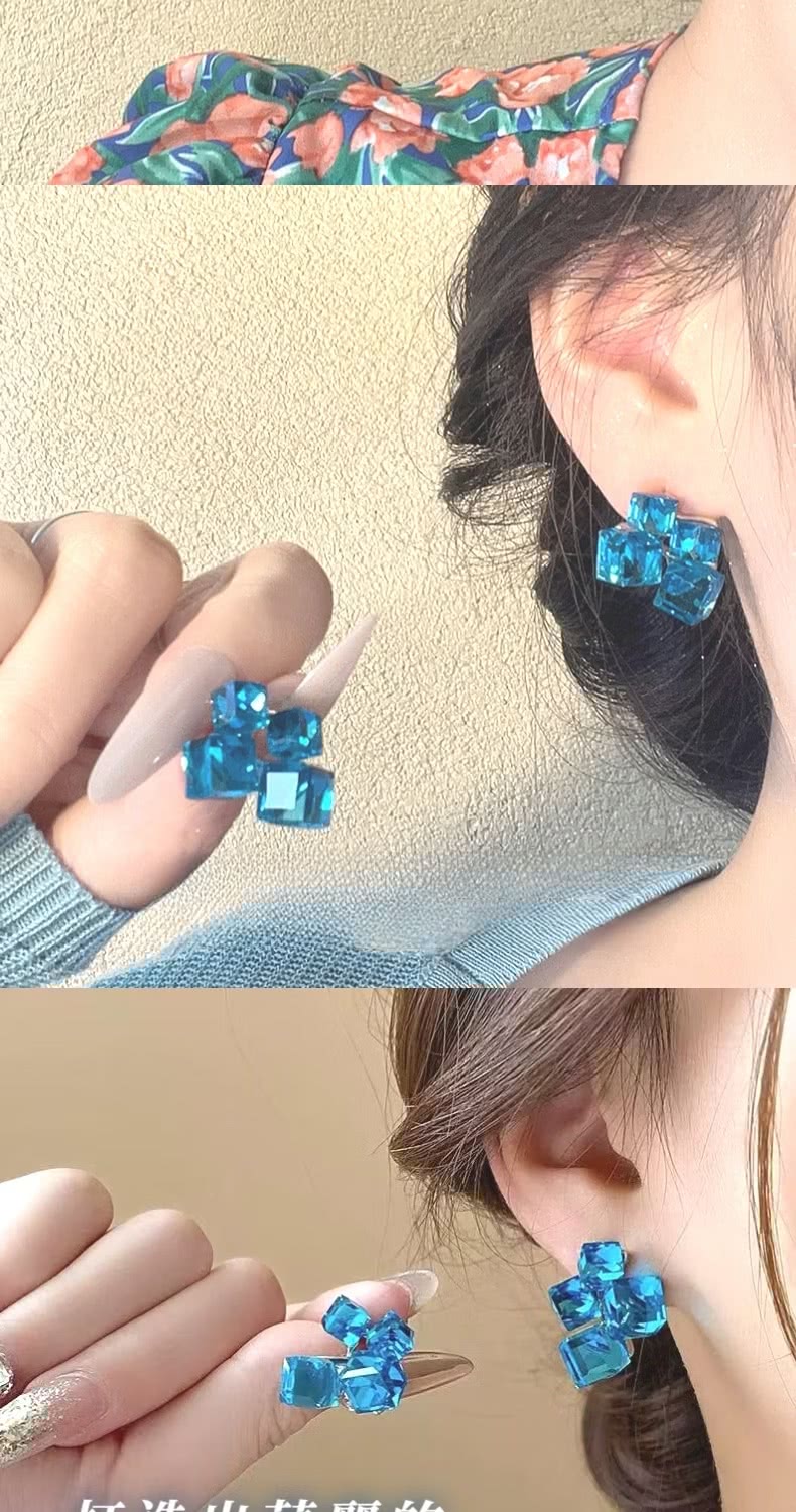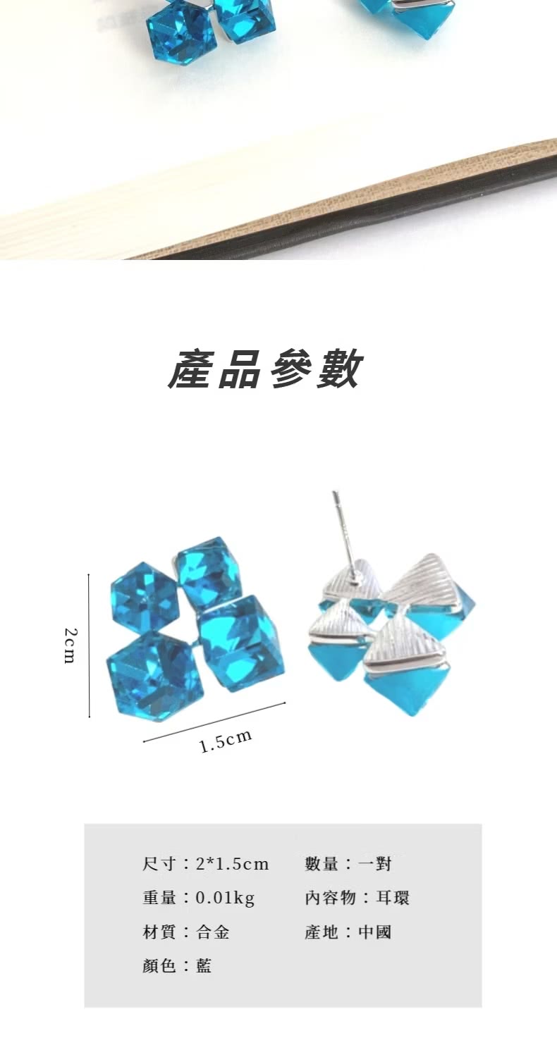 【輕奢穿搭】冰萃藍立體方糖水晶耳環(不規則 耳針 耳釘 耳飾 飾品)
