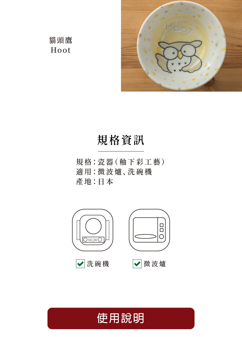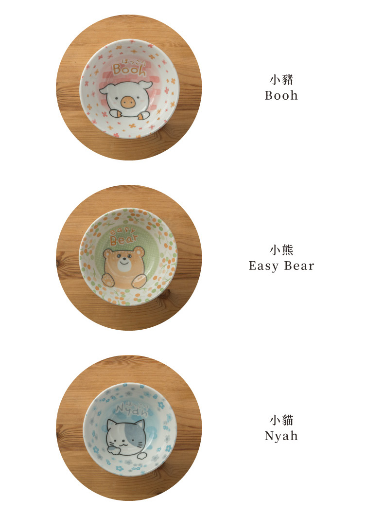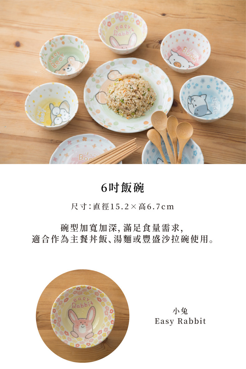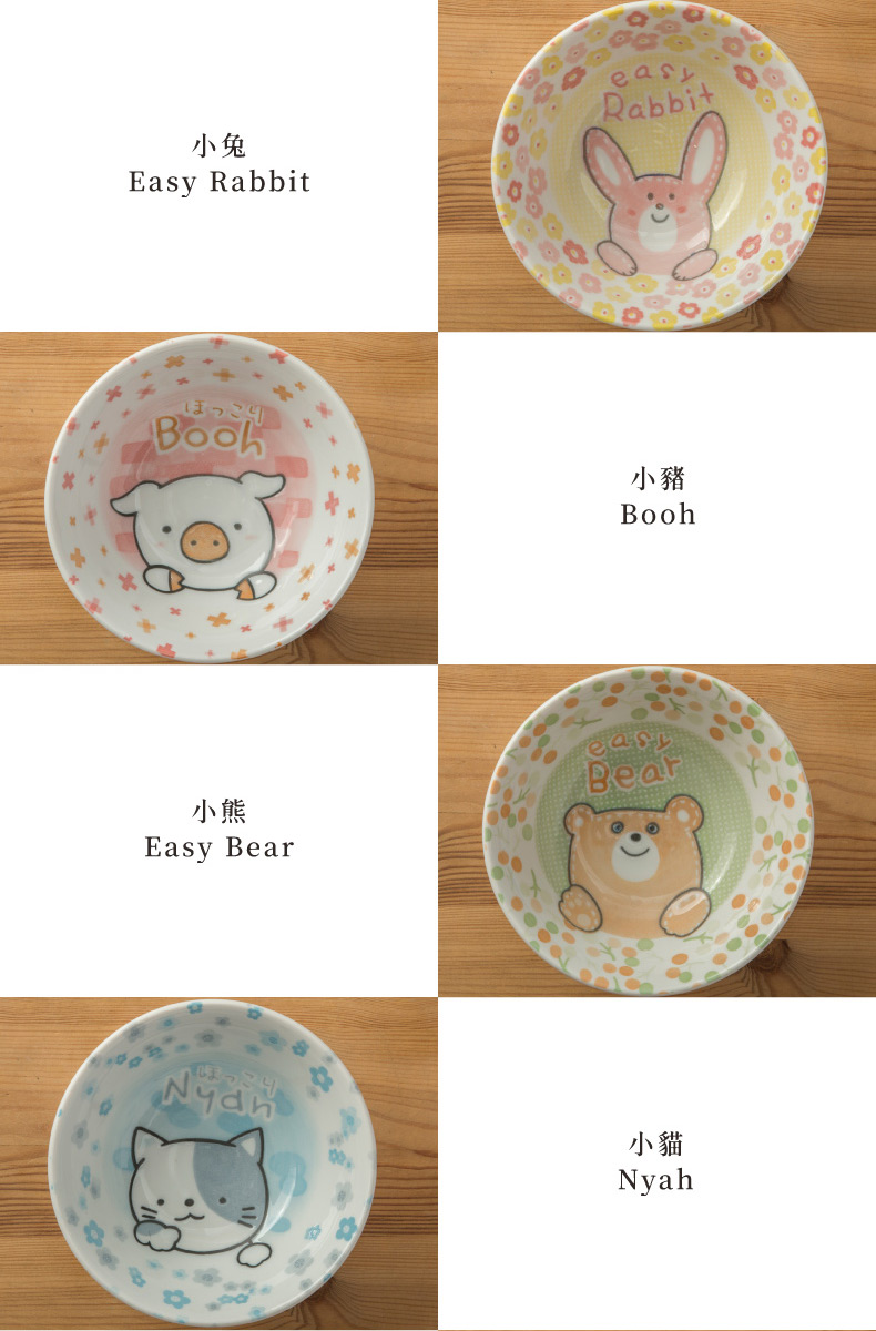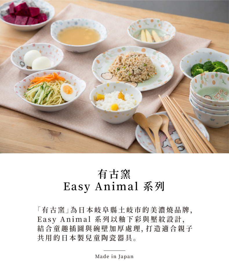 【日本製 美濃燒 有古窯】卡通釉下彩壓紋餐具|6吋卡通飯碗 兒童碗 白飯碗 • 尺寸:直徑15.2×高6.7cm(約6吋) • 適用:白飯、湯泡飯、配菜盛裝 • 圖樣:小兔/小豬/小熊/小貓/貓頭鷹(五款可愛插圖) • 工藝亮點:釉下彩+壓紋設計,色彩持久不褪 • 材質與安全:高溫燒製+無毒釉料,兒童安全使用 • 便利性:可微波、可洗碗機,方便清潔 • 品牌保證:日本美濃燒名窯 有古窯原廠製造,底部品牌燒印