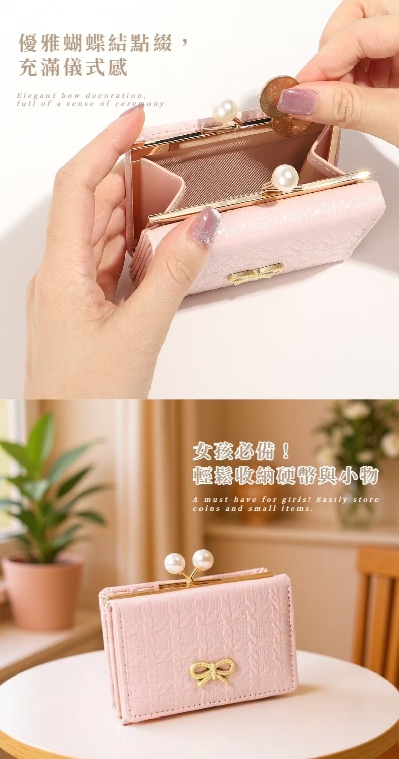 【韓系少女】氣質蝴蝶結零錢包(珍珠 短夾 摺疊皮夾 多卡槽 多卡位 女夾 女皮夾 女錢包 零