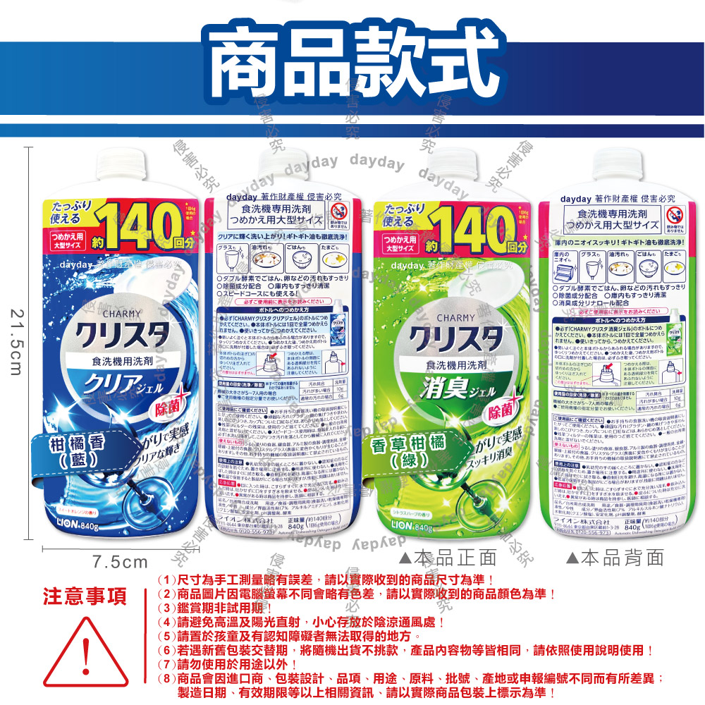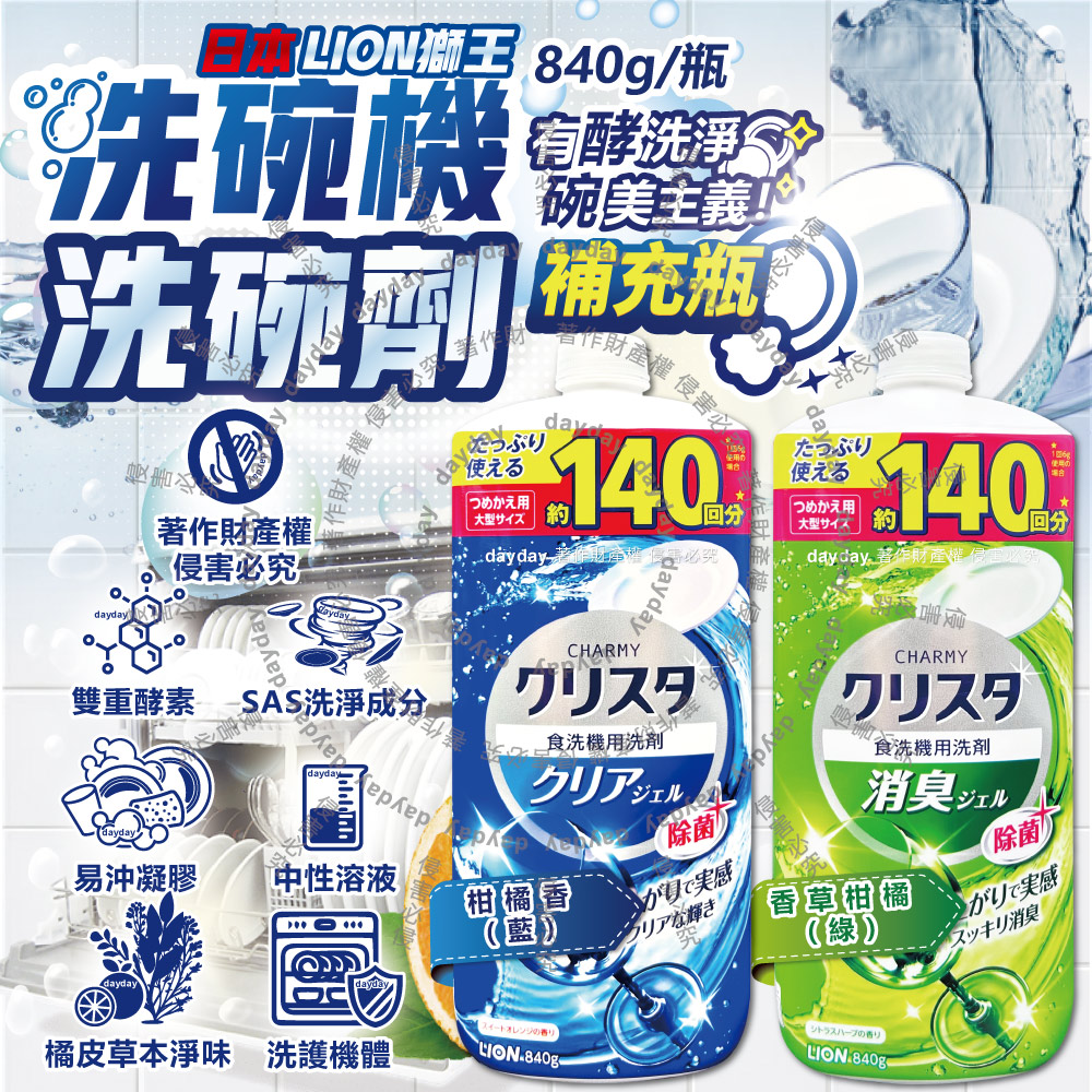 【日本LION獅王】CHARMY洗碗機專用耗材雙重酵素凝膠洗碗精補充瓶840g/瓶(碗盤餐具碗筷去油淨味洗碗凝露)