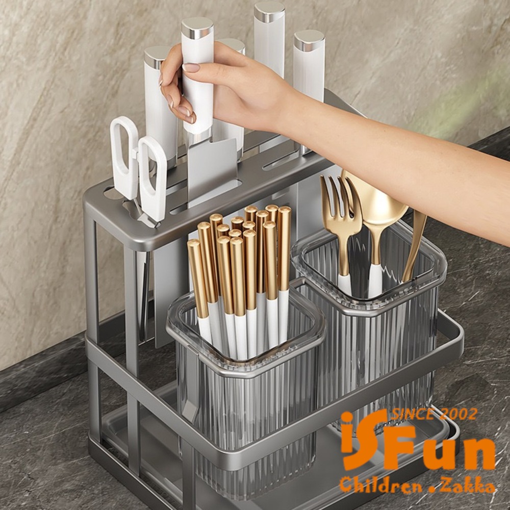 【iSFun】簡約生活 免打孔壁掛廚房餐具收納瀝水架(黑色雙筒+刀架)