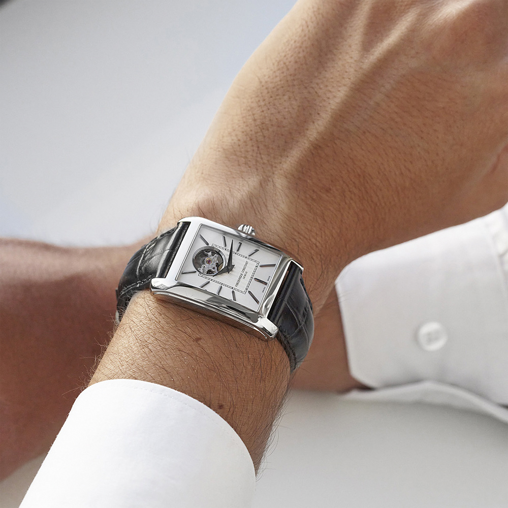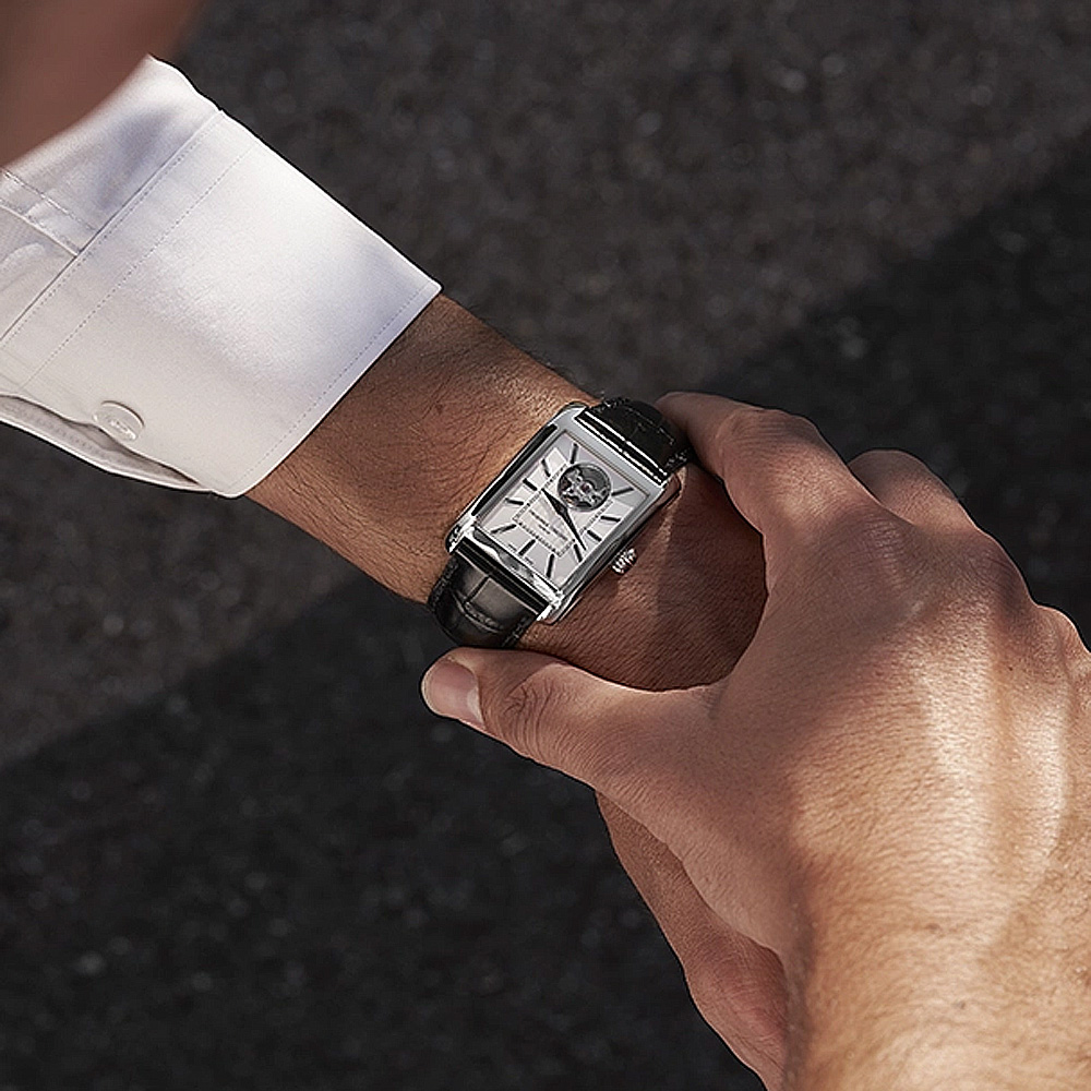 Classics Carrée Heart Beat 自動腕錶已推出 Heart Beat 版本,十二點鐘位置的一個開口展示了機芯:腕錶跳動的心臟。這項標誌性設計將裝飾藝術錶殼的永恆優雅與位於 12 點鐘位置的可見現代擒縱機構融為一體。這款腕錶呈現了康斯登品牌精神的同時,透過復興這一標誌性造型,鞏固了其作為經典製錶製造商的地位。