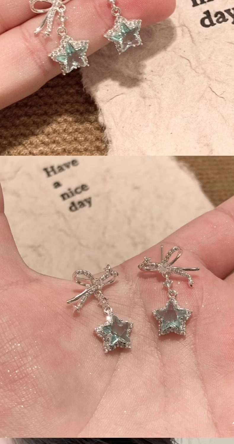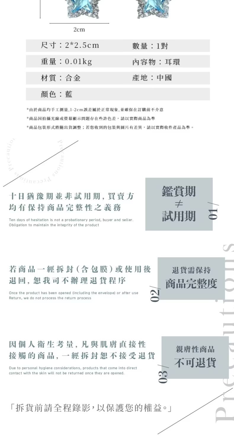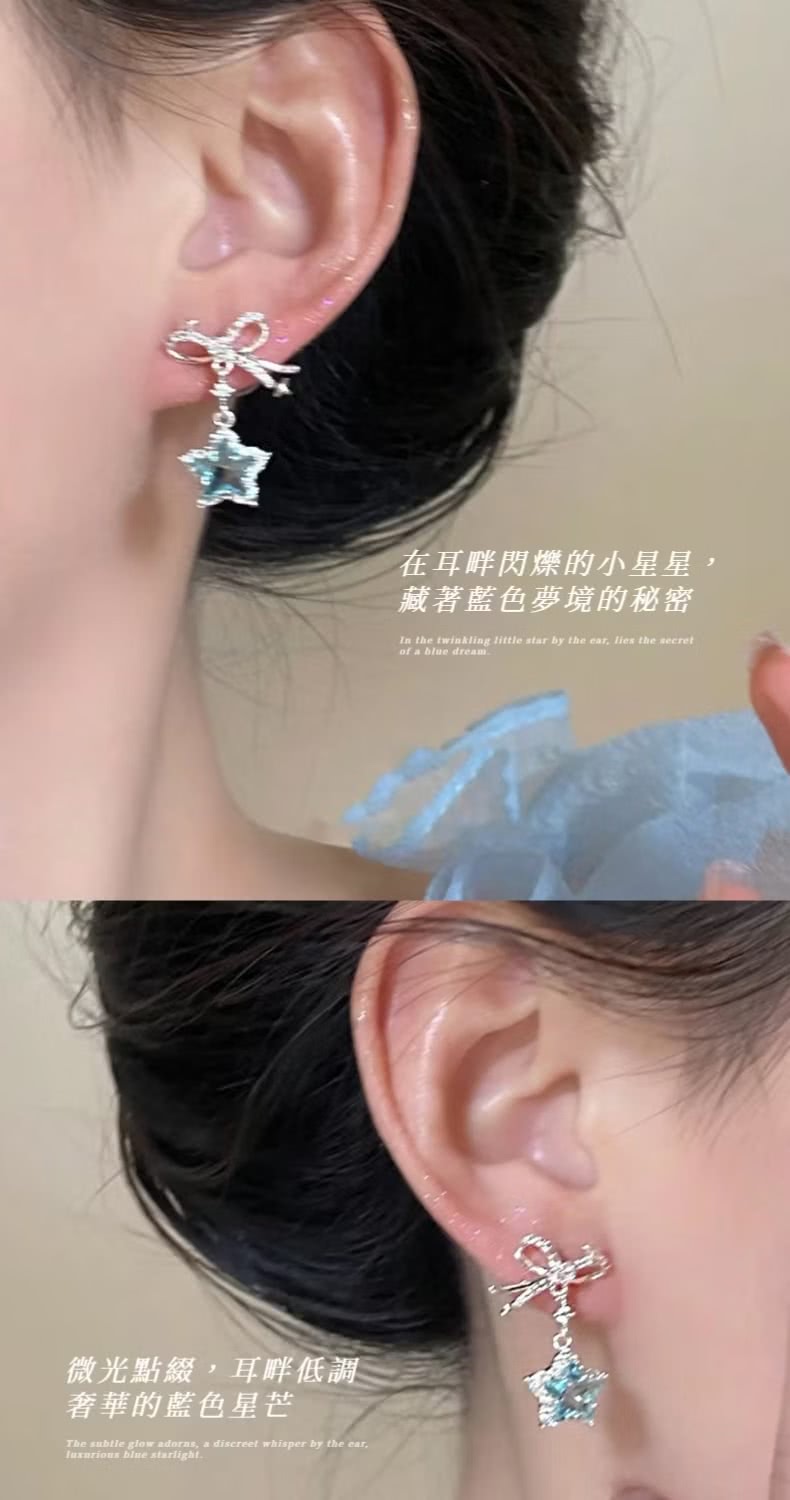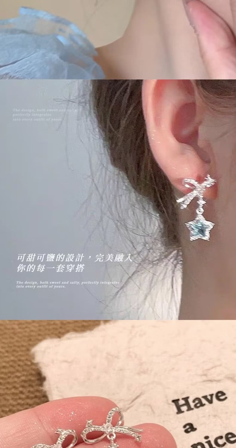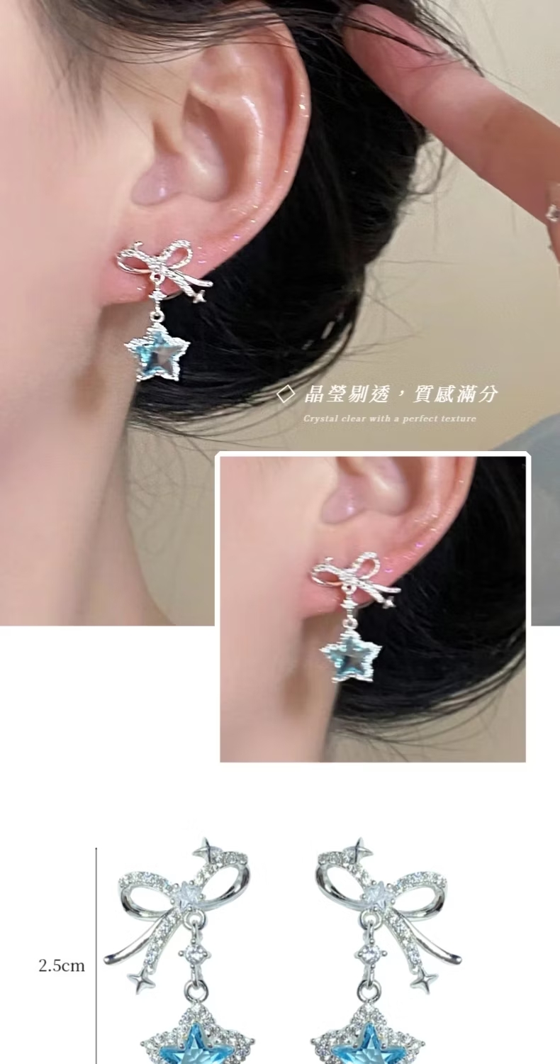 【清透星空】藍晶五角星蝴蝶結耳環1對(滿鑽 鑲鑽 耳針 配飾 耳飾)