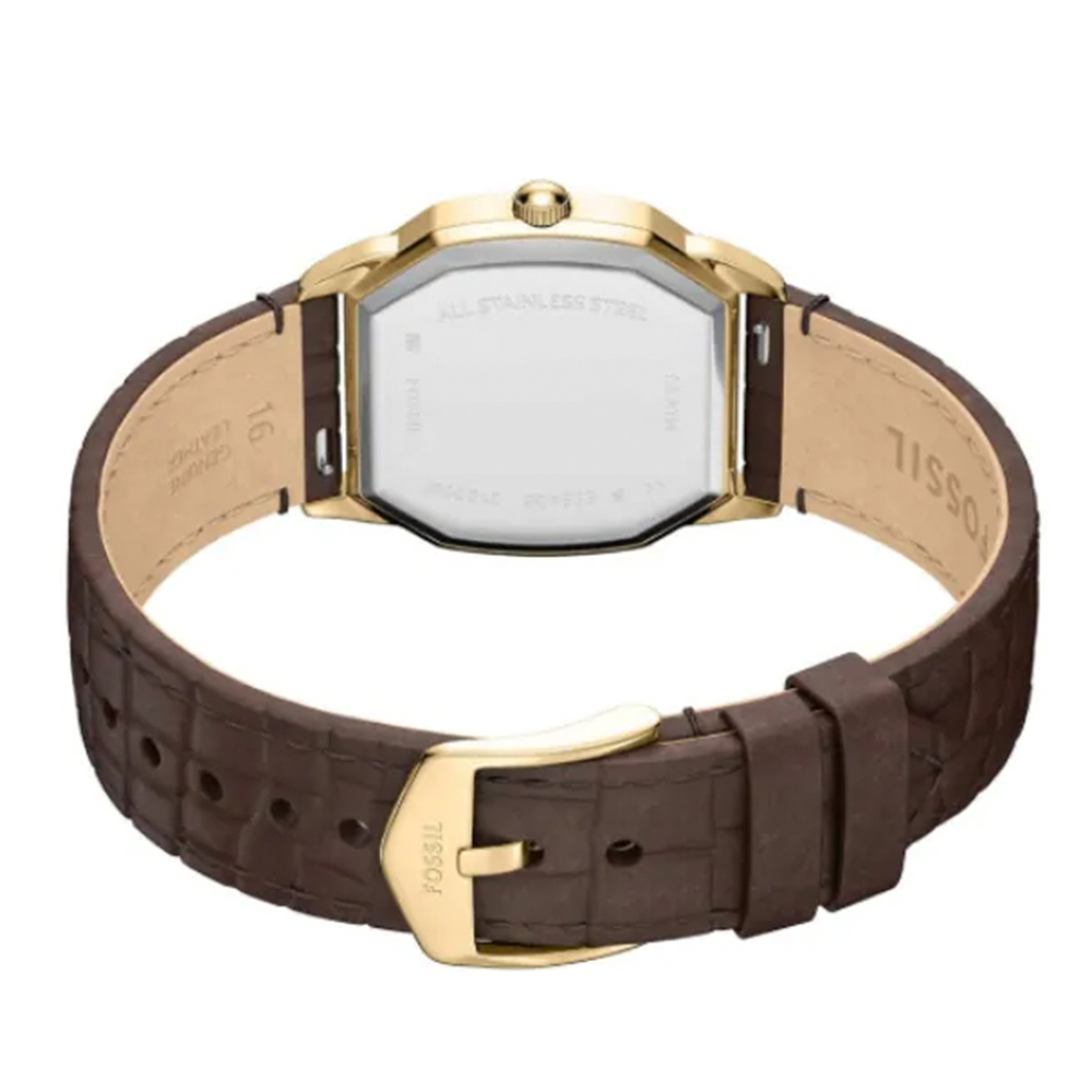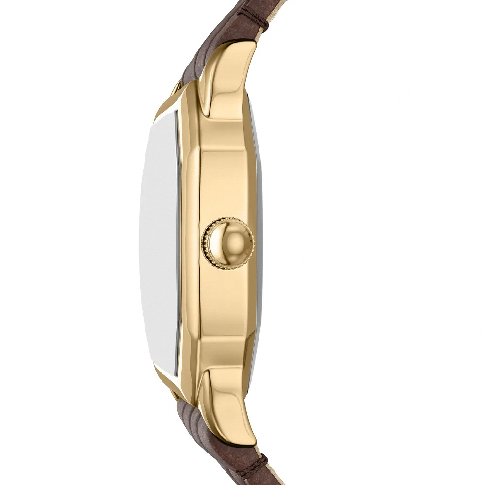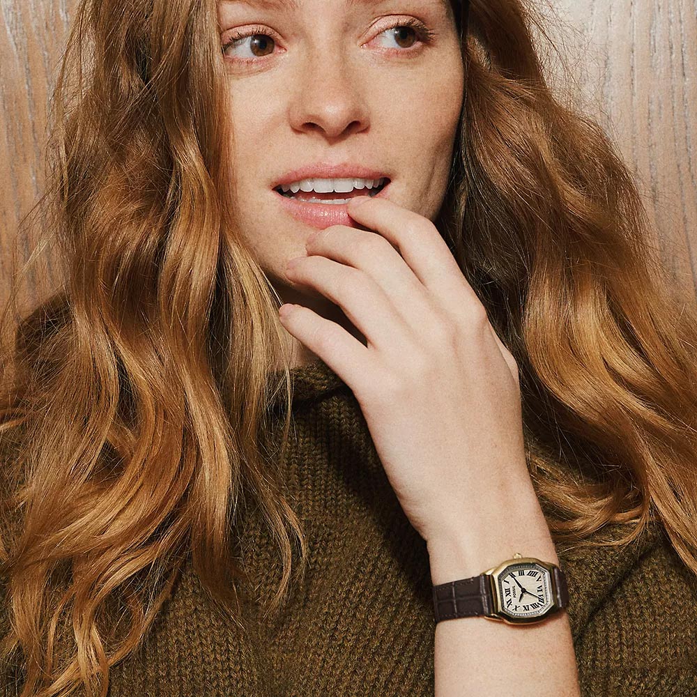 搭配棕色鱷魚壓紋皮革錶帶,將幾何俐落與經典溫潤完美融合