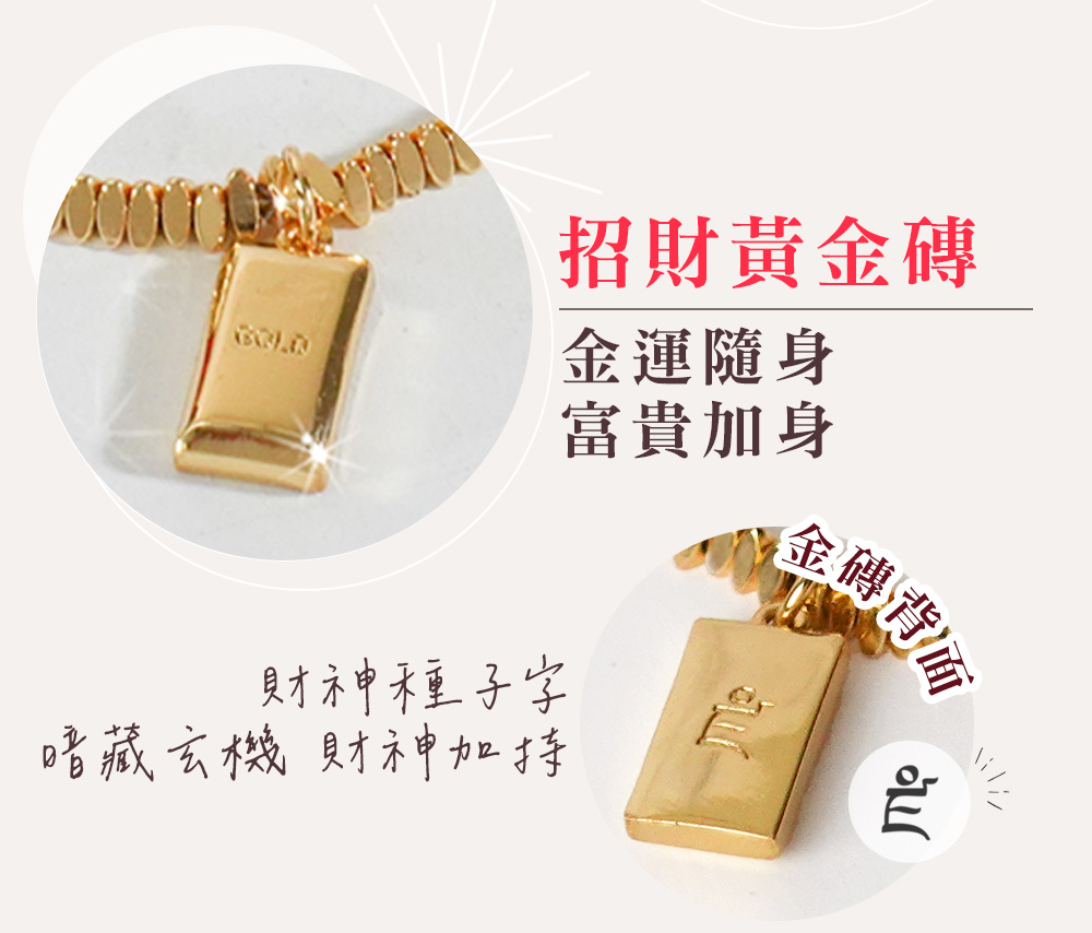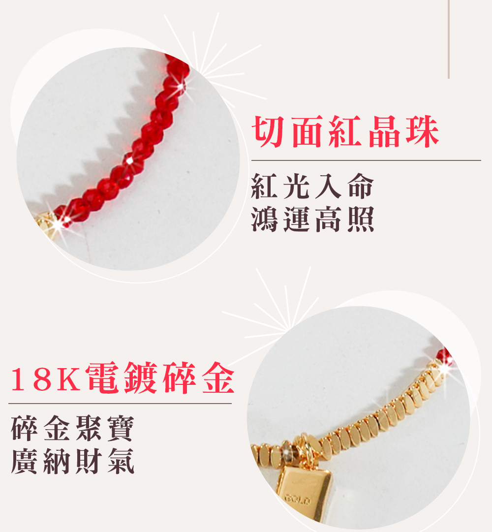 黃金磚紅晶線手鍊是紅線的精緻 Level Up!以切面紅晶串成手鍊,紅色屬火,能催旺財運、提升人緣並守護正能量。搭配黃金磚設計,背刻財神種子字,寓意財神庇佑、財氣穩固;切面紅晶珠在光源下閃耀璀璨光芒,象徵化煞聚財;18K 真金電鍍配飾質感奢華,耐磨耐汗,金光持久不褪。佩戴的瞬間,如同獲得財神護佑,讓你在任何場合都能財氣相隨、貴人加持,成為幸運滿滿的主角!