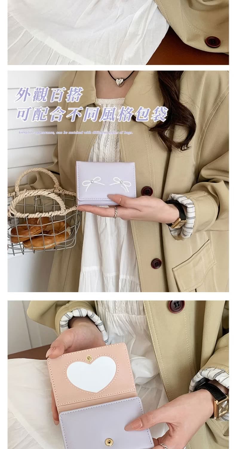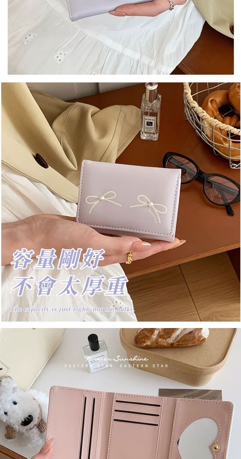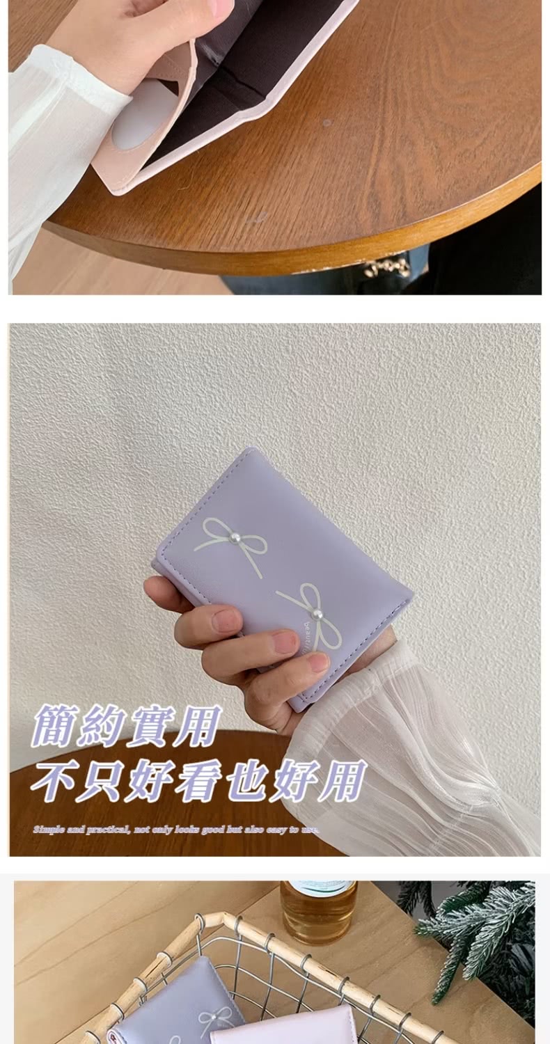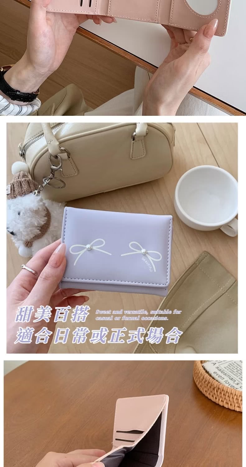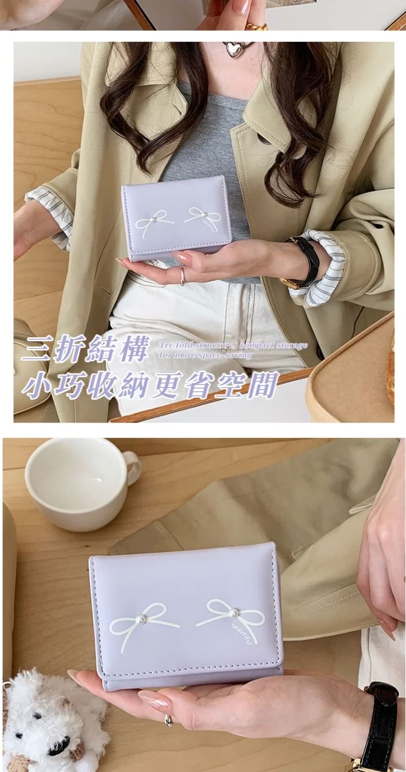 【春日百搭】珍珠蝴蝶結三折錢包(韓版 短夾 多卡槽 多卡位 女夾 女皮夾 女錢包 零錢袋 女士)