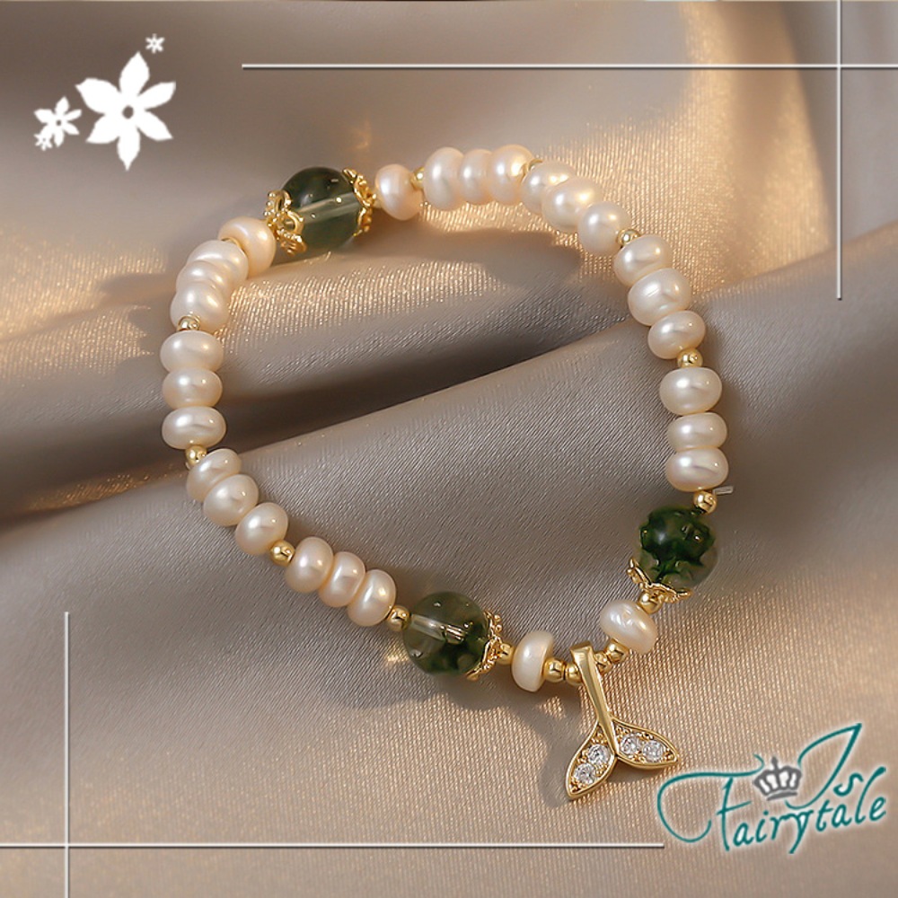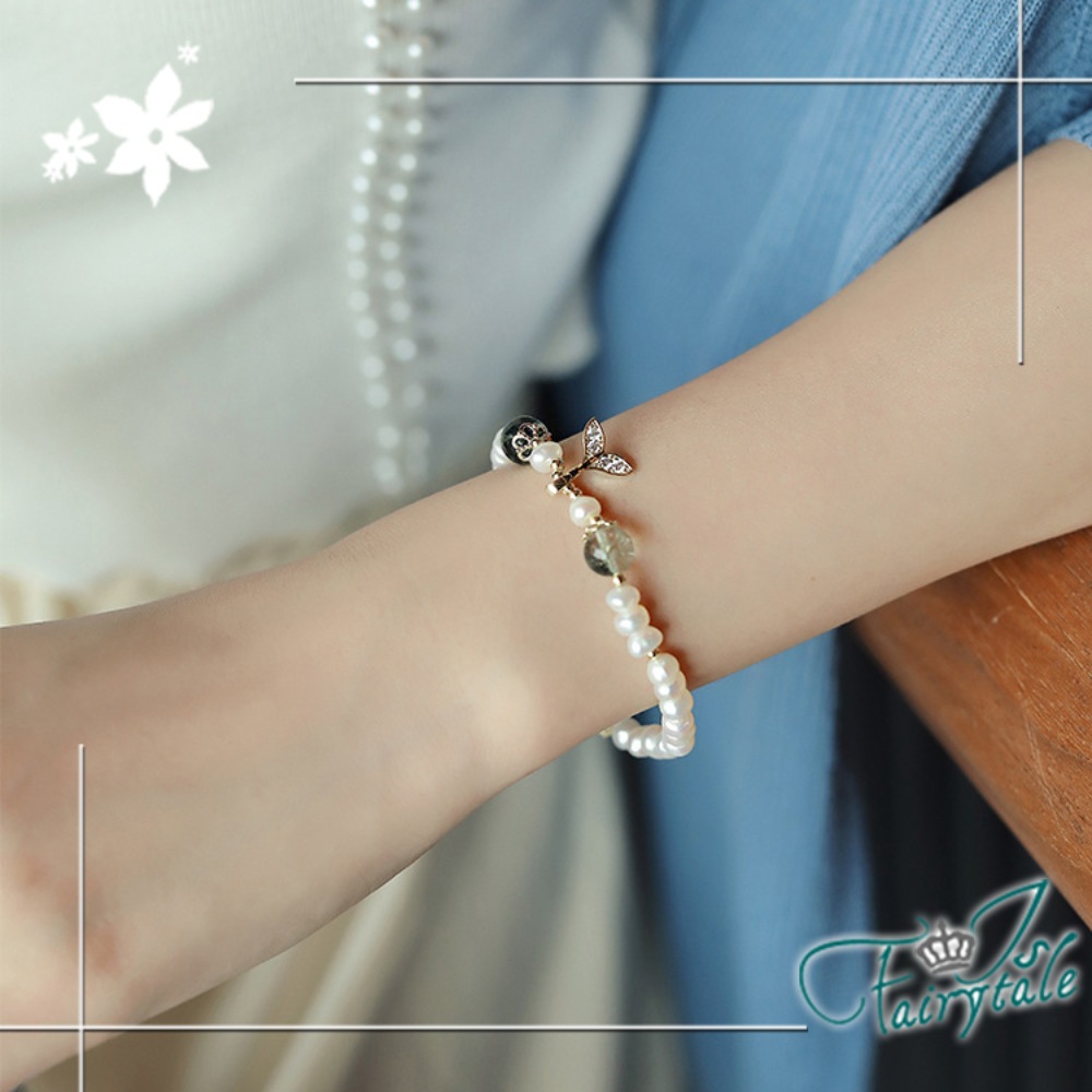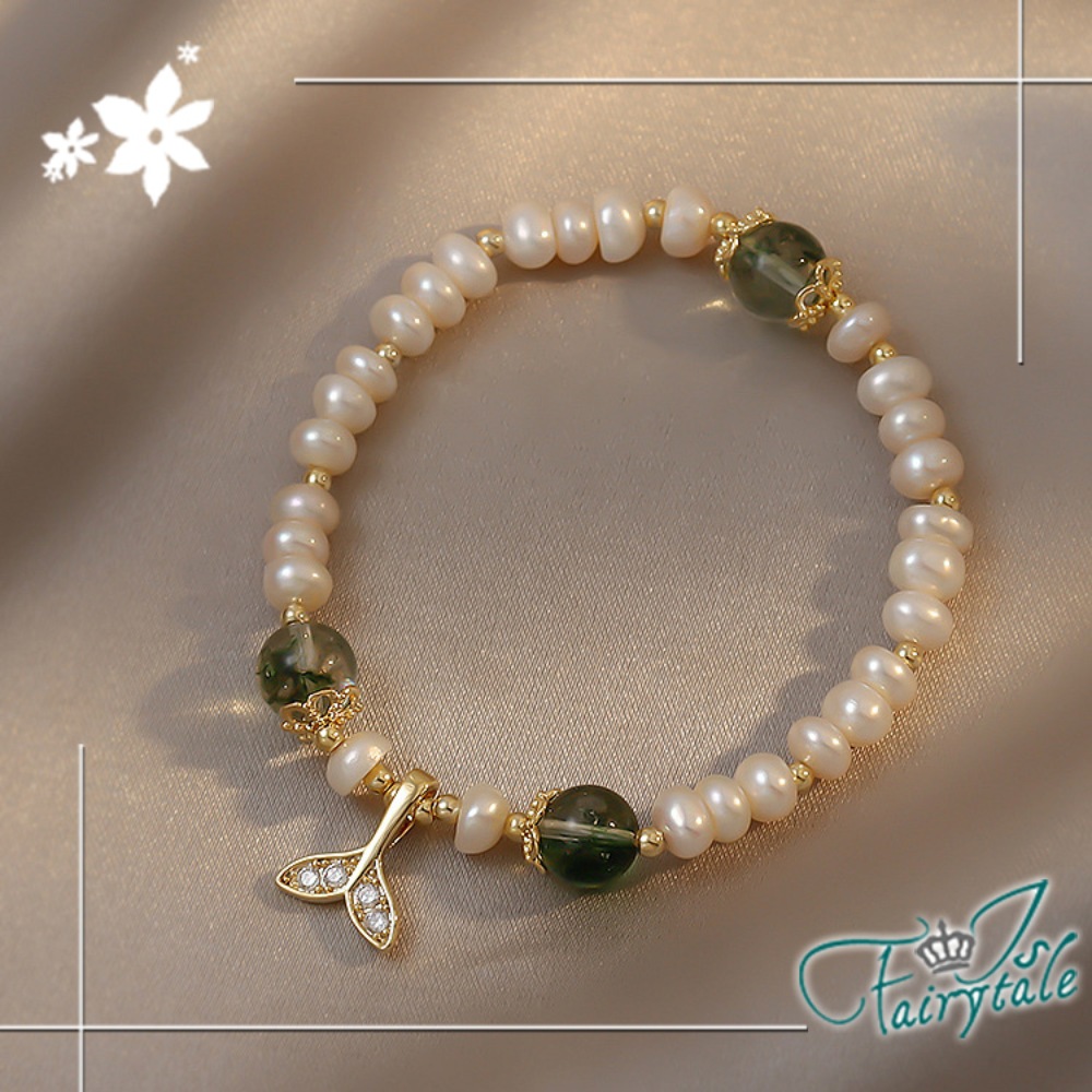 【伊飾童話】水鑽魚尾 綠髮晶不規則淡水珍珠伸縮手鍊