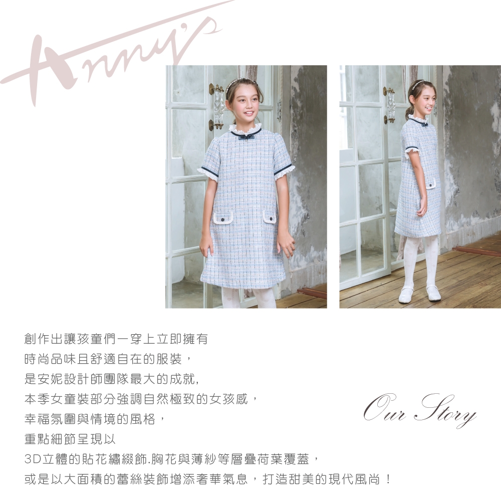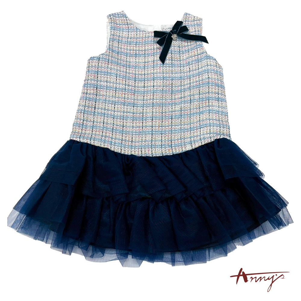 【ANNY’S 安妮公主】童裝 氣質格紋小香風網紗拼接蝴蝶結秋冬款無袖洋裝(3219水藍)