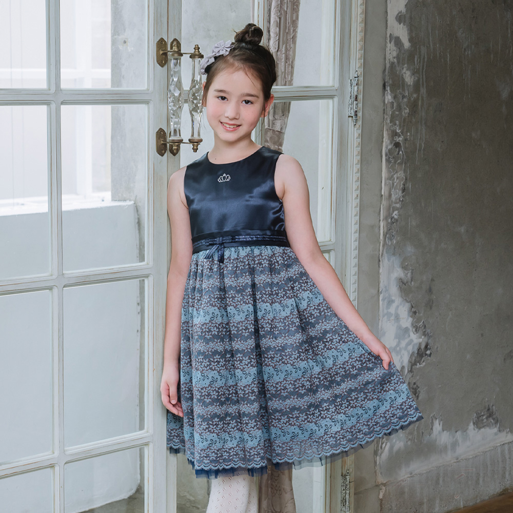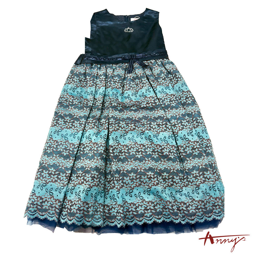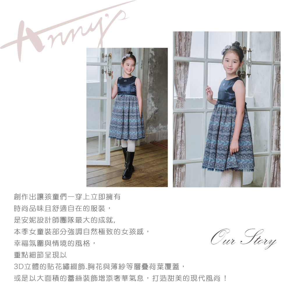 【ANNY’S 安妮公主】童裝 氣質碎花蕾絲裙腰帶蝴蝶結綁帶秋冬款無袖禮服(3208藍)
