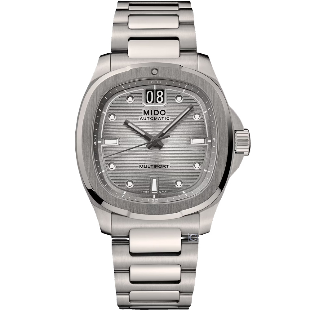 Multifort 腕錶兼具日常佩戴和刺激冒險的完美之選,其實用功能尤其引人注目,位於錶盤頂部的大日期顯示格外醒目。雙面防反光平面藍寶石水晶鏡面,確保淺灰色錶盤清晰可見,並飾有醒目的放射狀旭日紋。煙燻漸層色向邊緣逐漸變暗,更添層次感,引人注目。時針、分針以及彩繪小時刻度,形成迷人的表面對比,提升易讀性。水平凹槽貫穿錶盤,色調隨光線變化而變幻,營造出動感的視覺效果。環繞錶盤的分鐘刻度圈,為原本精緻的設計增添一抹運動氣息。最後,主要時標和指針上覆有白色 Super-LumiNova 夜光塗層,確保黑暗中的清晰可讀——無論何種情況下,這都是必不可少的點綴。