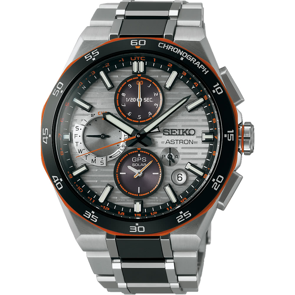 錶圈和錶鍊中央部分採用黑色陶瓷材質,並在各個部件上點綴霓虹橙色,營造出動感十足的設計