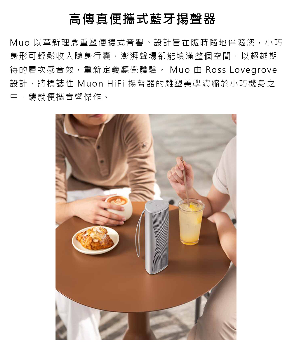 Muo 以革新理念重塑便攜式音響。設計旨在隨時隨地伴隨您,小巧身形可輕鬆收入隨身行囊,澎湃聲場卻能填滿整個空間,以超越期待的層次感音效,重新定義聽覺體驗。 Muo 由 Ross Lovegrove 設計,將標誌性 Muon HiFi 揚聲器的雕塑美學濃縮於小巧機身之中,鑄就便攜音響傑作。