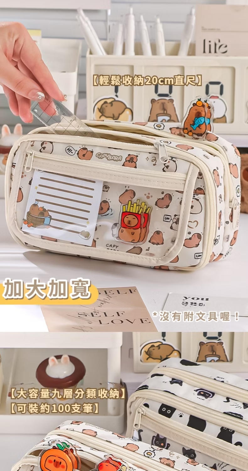 【很能裝】卡皮巴拉插畫收納三層筆袋(翻蓋 收納袋 文具袋 鉛筆盒 大容量 透明 插畫 可愛 學生 生日禮物)