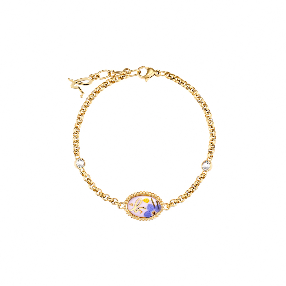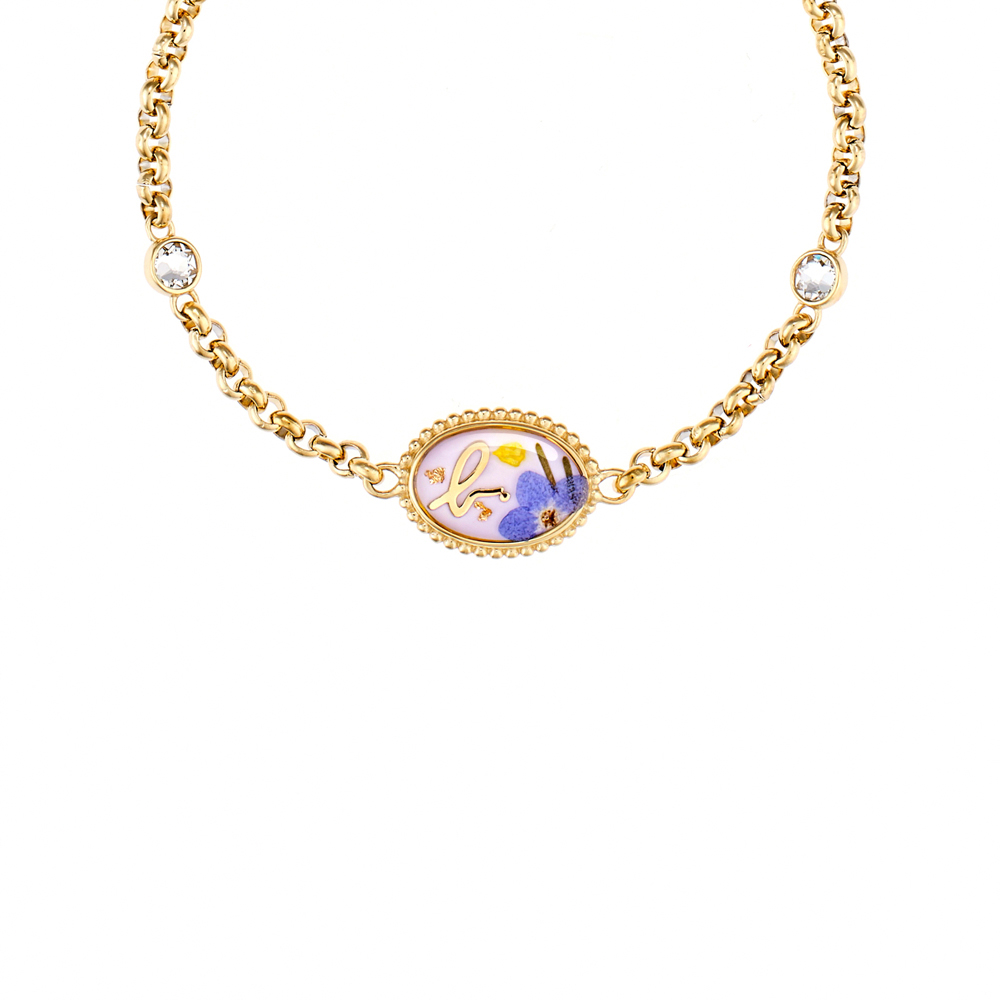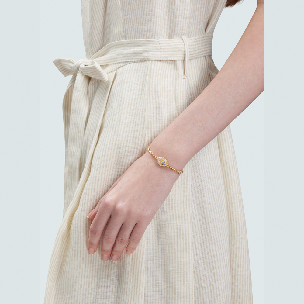 這款手鍊以 "Garden of Dreams" 為主題設計,中央橢圓形的樹脂內含乾花、樹脂及金箔。它採用電鍍14K黃金色白鋼製成,並經拋光處理,綴以精緻的自然元素,創造出簡單純粹的形象。