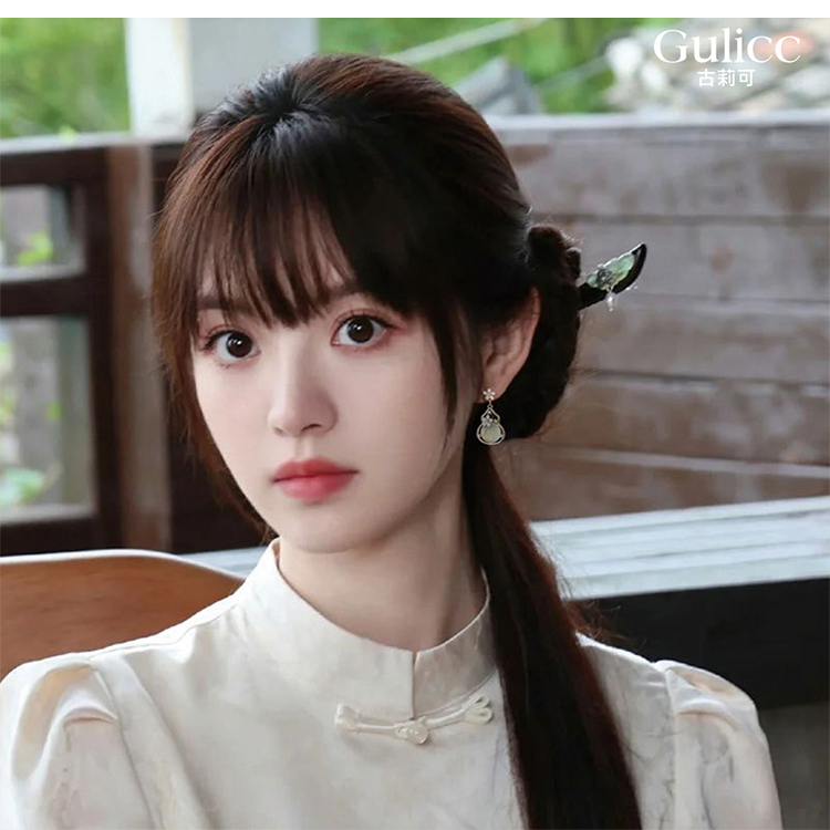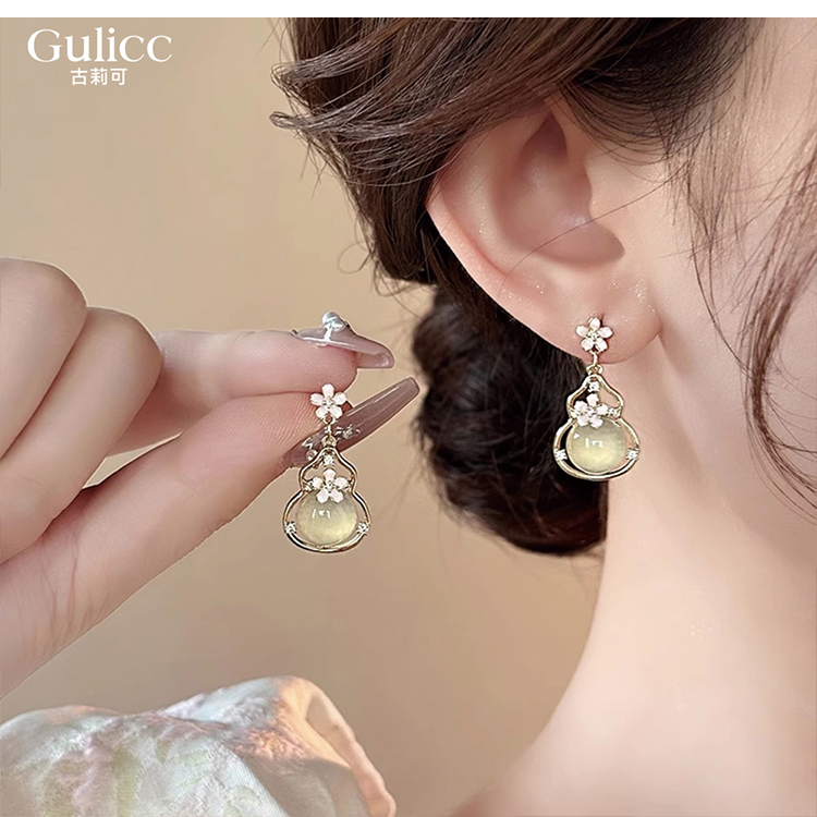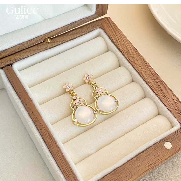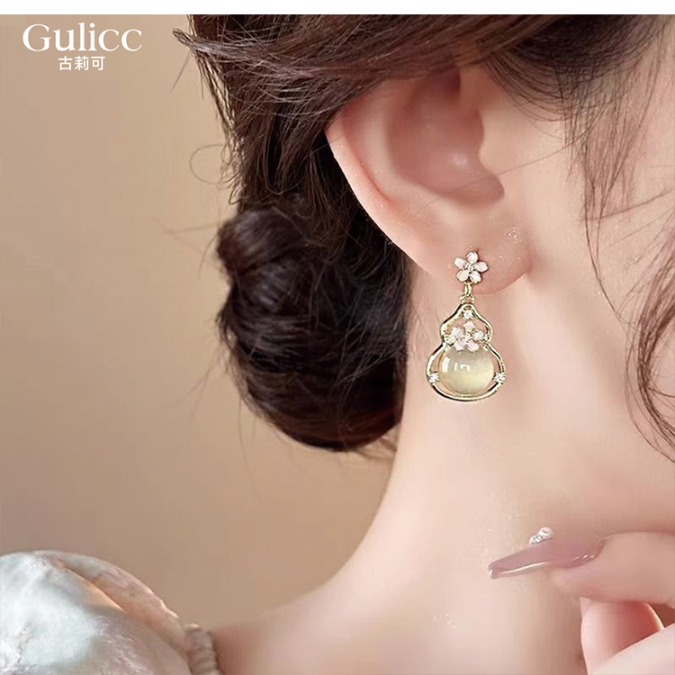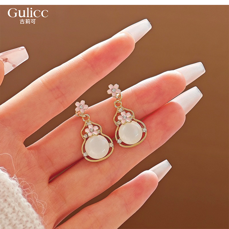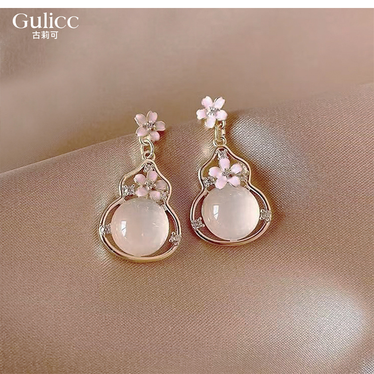 【Golicc】中式 貓眼石 粉葫蘆花 耳環(雙十 萬聖節 生日 飾品 耳釘 耳飾 耳墜 禮物)