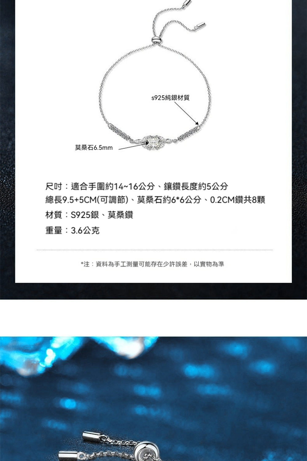 ✨ 商品尺吋:適合手圍約14~16公分、鑲鑽長度約5公分、總長9.5+5CM(可調節)、莫桑石約6*6公分、0.2CM鑽共8顆