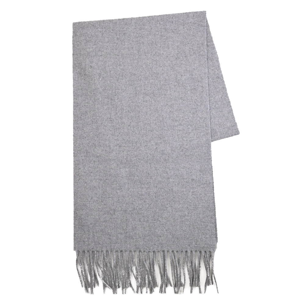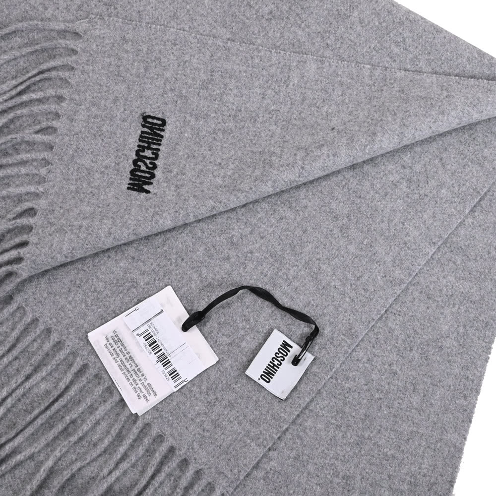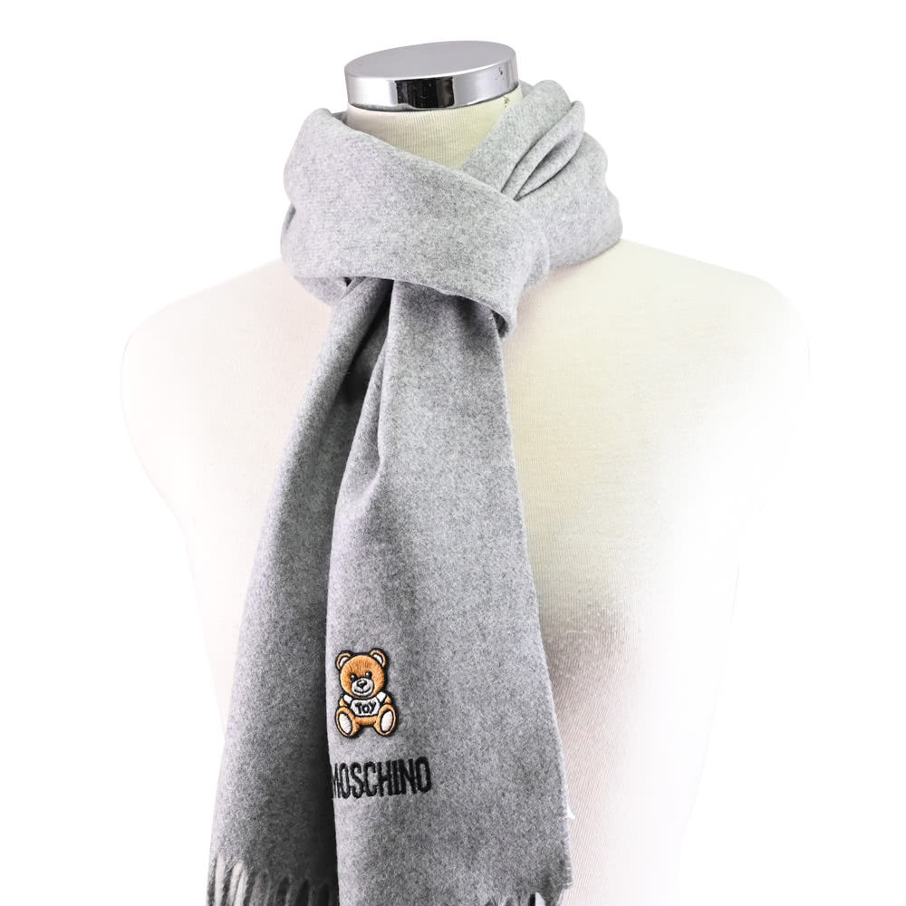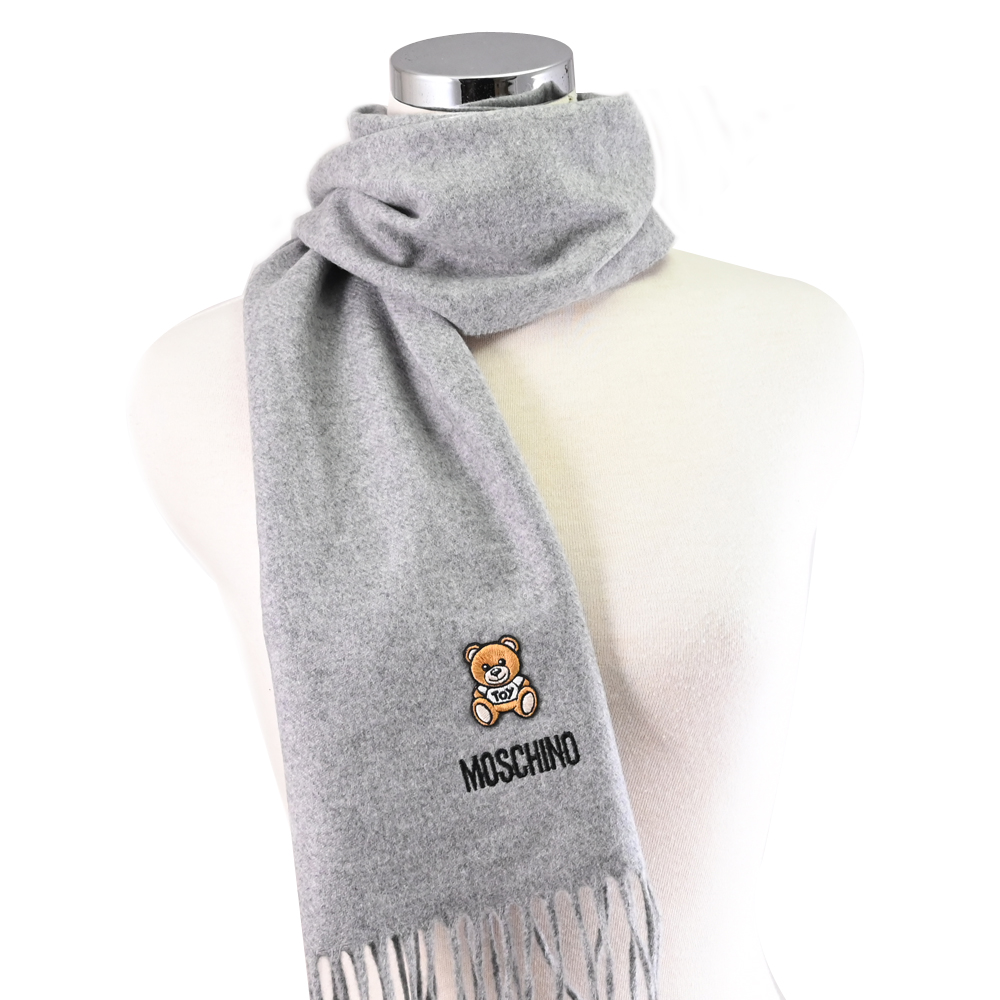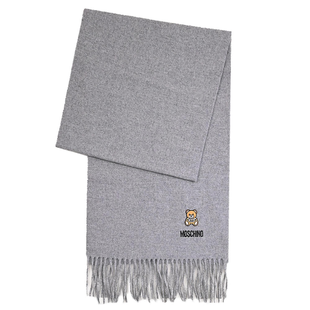 【MOSCHINO】簡約電繡小熊LOGO純羊毛流蘇保暖披肩長圍巾(灰)