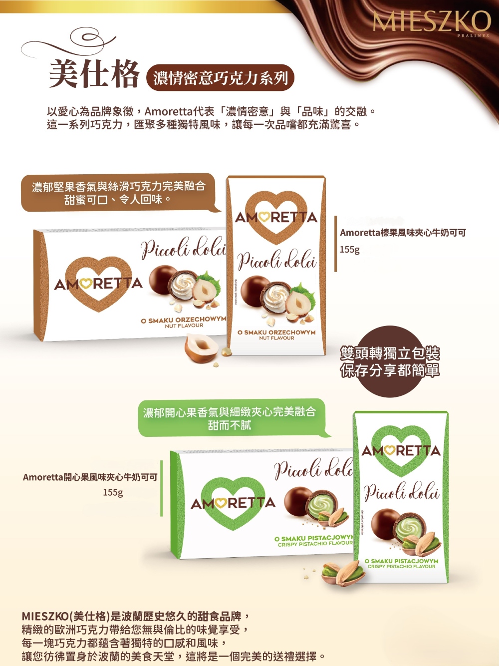 【Mieszko 美仕格】Amoretta 開心果風味夾心牛奶可可155g