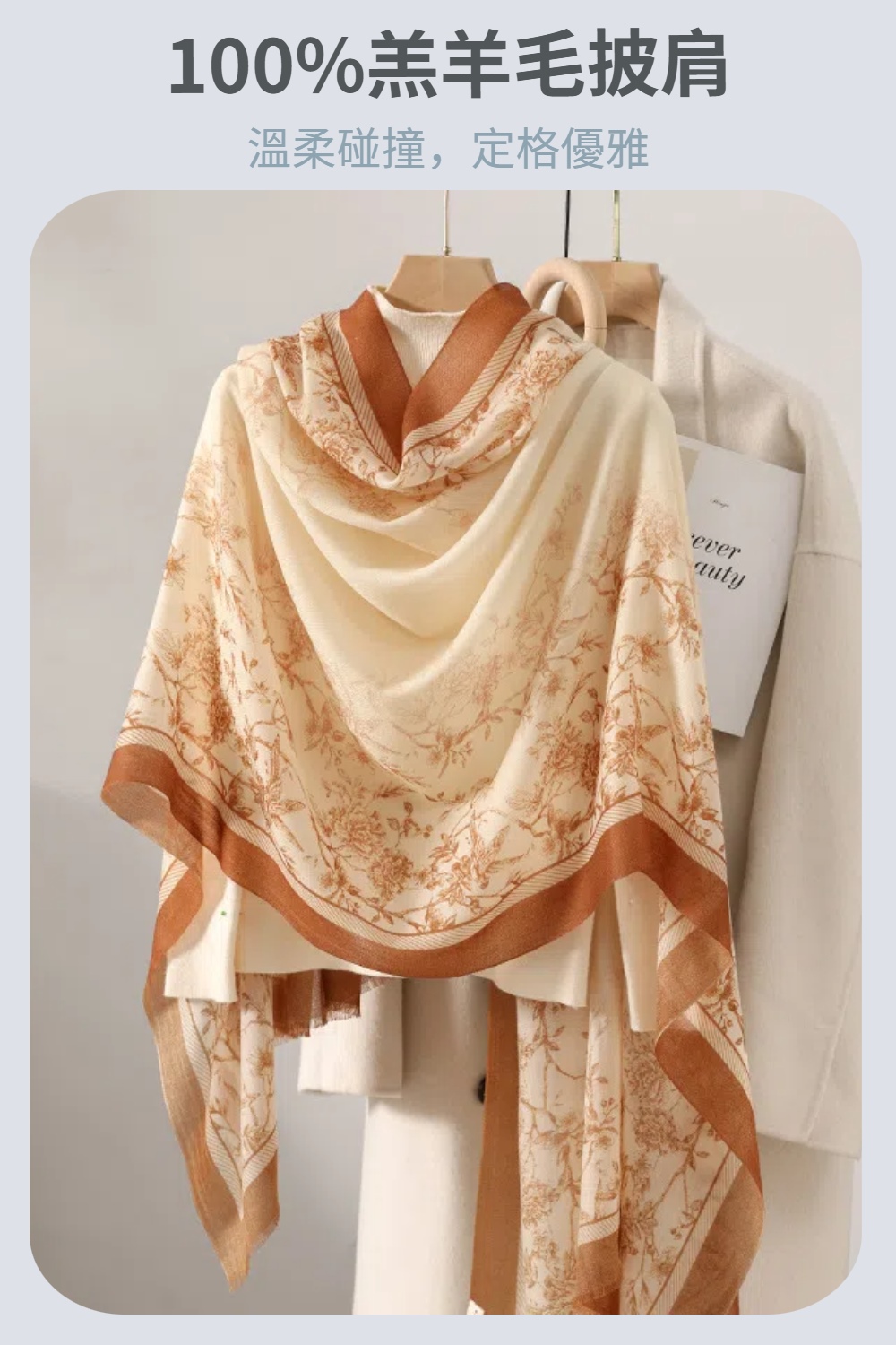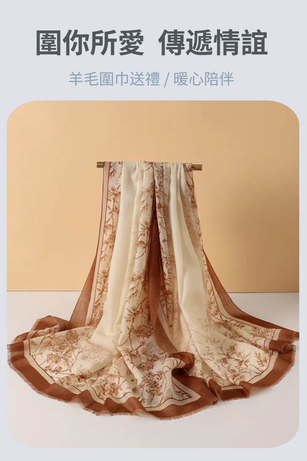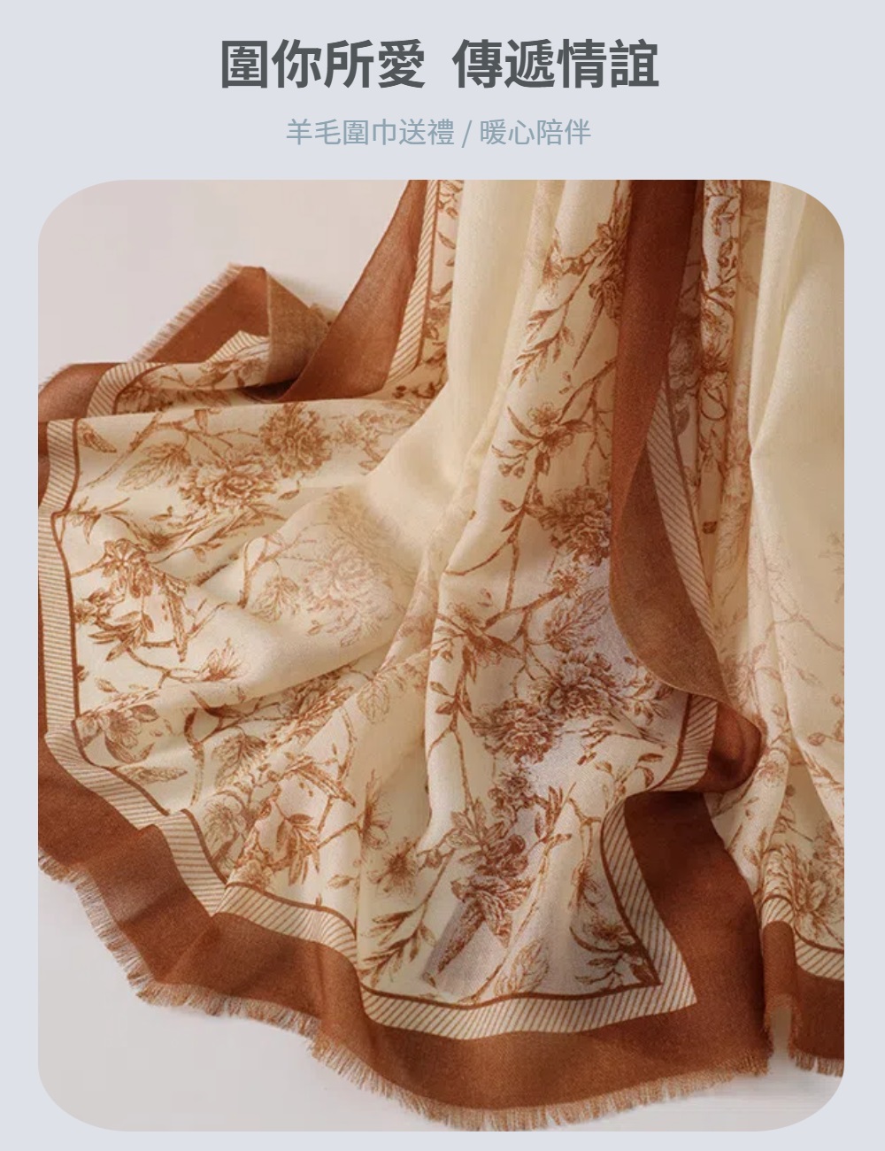 【I.Dear】100%羔羊毛民族風印花加大尺寸精梳羊毛圍巾披肩(橘米色/羔羊絨/交換禮物)