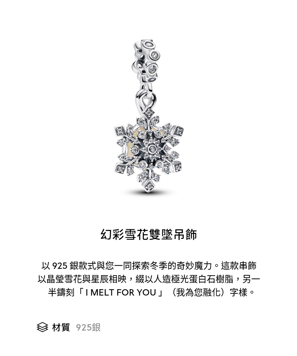 以 925 銀款式與您一同探索冬季的奇妙魔力。這款串飾以晶瑩雪花與星辰相映,綴以人造極光蛋白石樹脂,另一半鑄刻「 I MELT FOR YOU 」(我為您融化)字樣。