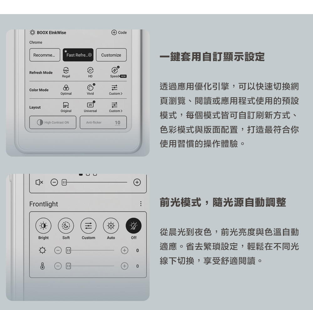 搭載八核心處理器、8GB 記憶體與 BOOX 超級刷新技術(BSR),操作滑順靈敏,頁面切換順暢自然。透過應用優化引擎,可一鍵切換閱讀、網頁或應用模式,並自由自訂刷新與色彩設定。