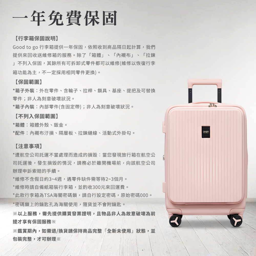 購買起一年內,可維修之零組件,包含輪子、拉桿、密碼鎖、提把等消耗品,完全不收取維修費及零件費