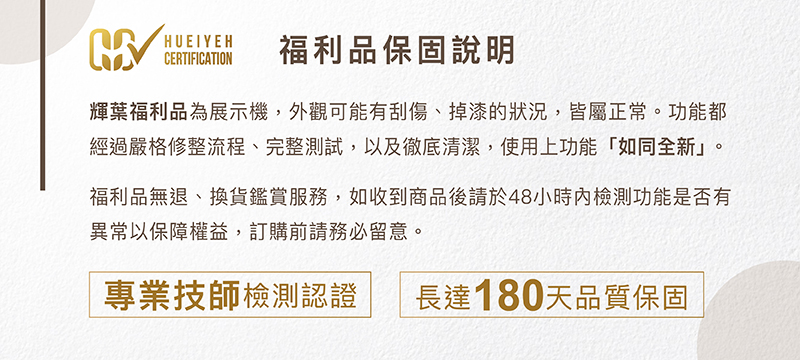 鑑賞期期間除商品功能故障 ,不做退、換貨服務原廠保固180天