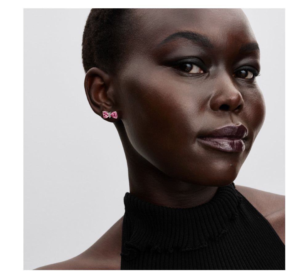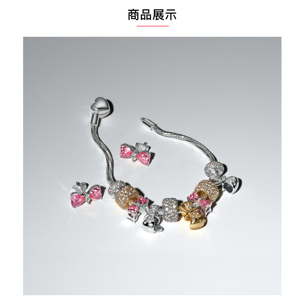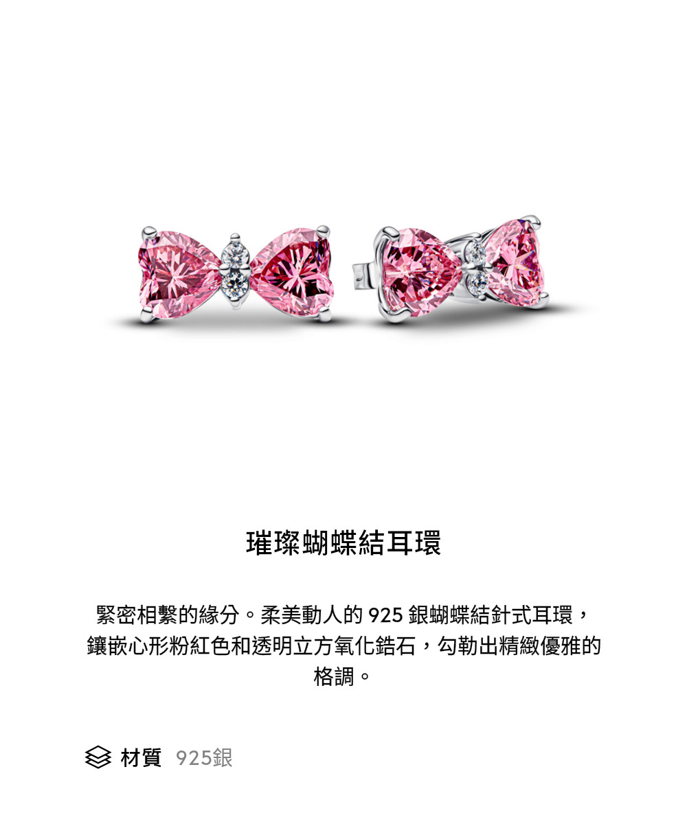 緊密相繫的緣分。柔美動人的 925 銀蝴蝶結針式耳環,鑲嵌心形粉紅色和透明立方氧化鋯石,勾勒出精緻優雅的格調。