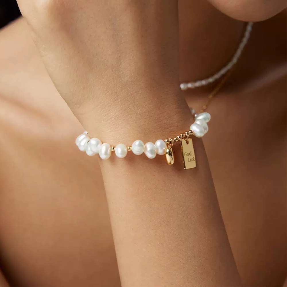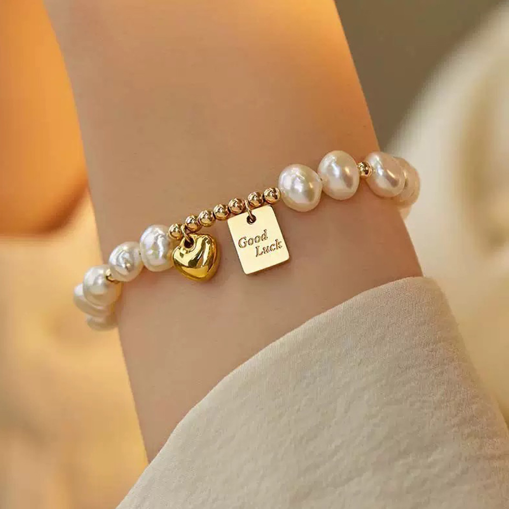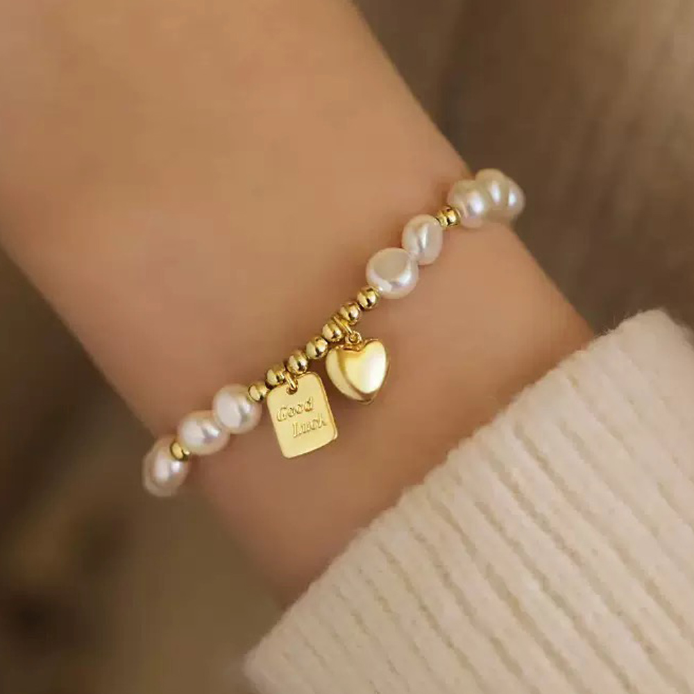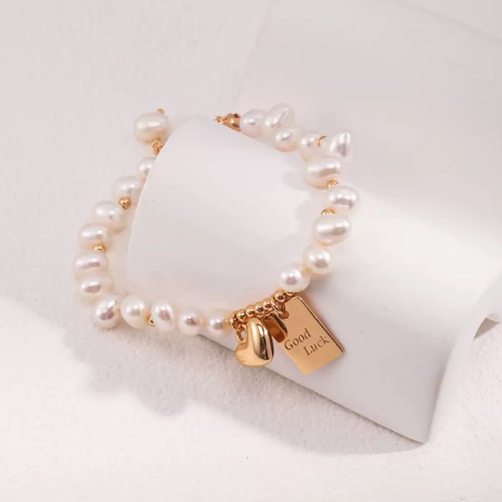 【SUMMER 一夏】雙11 法式巴洛克不規則珍珠幸運方牌愛心吊墜精緻輕奢手鍊(法式巴洛克風)