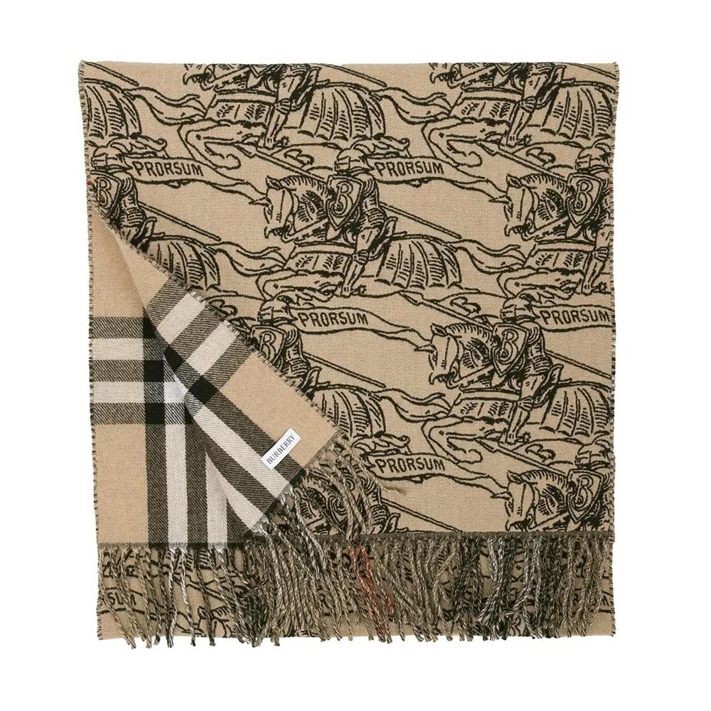 【BURBERRY 巴寶莉】雙面兩用騎士標/格紋羊毛流蘇圍巾(米色)