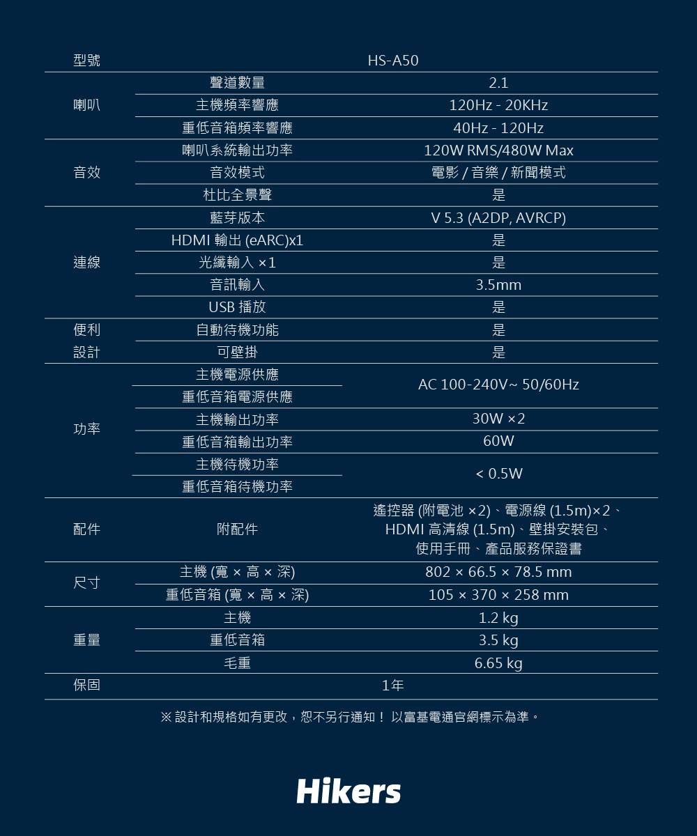 【Hikers】2.1聲道無線重低音藍芽家庭劇院 HS-A50(Soundbar二入組)