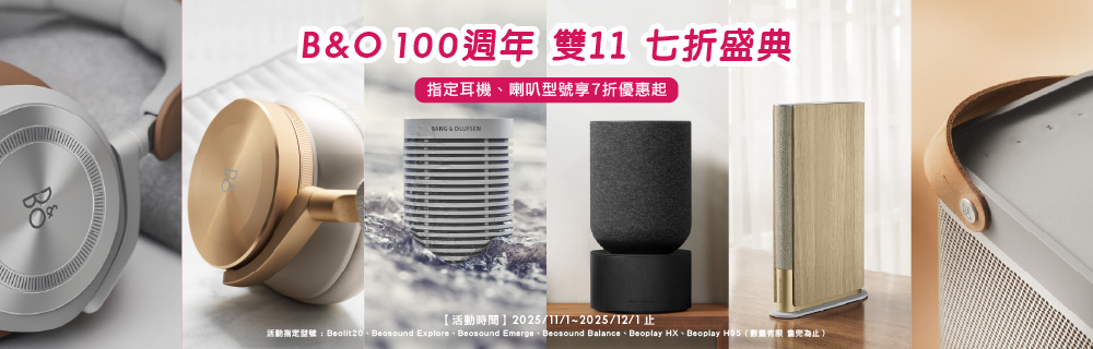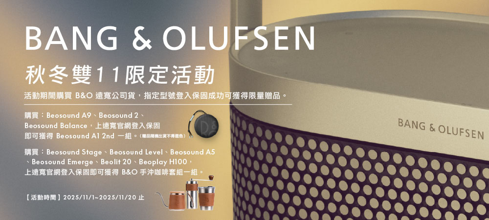 活動期間2025/11/1~2025/11/20止 凡購買B&O遠寬公司貨,指定型號登入保固成功可獲得限量贈品。