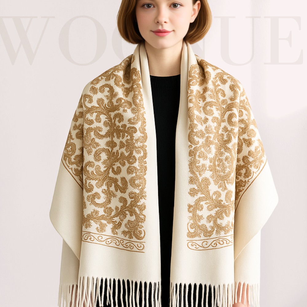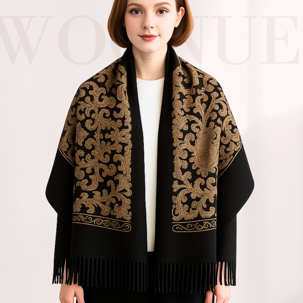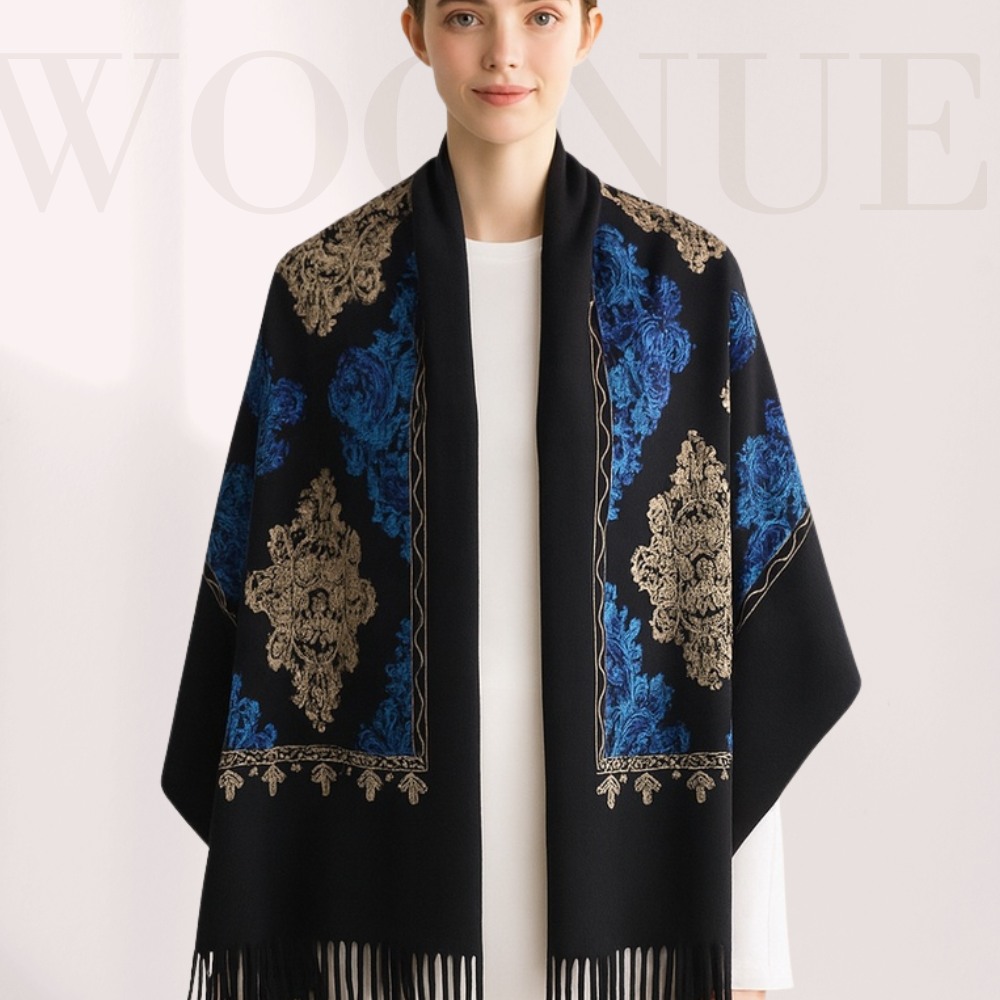 【WOONUE】杜拜貴婦專櫃刺繡柔羊毛絨質感親膚寬版時尚斗篷圍巾冷氣披肩(女友老婆媽媽情人生日聖誕禮物)
