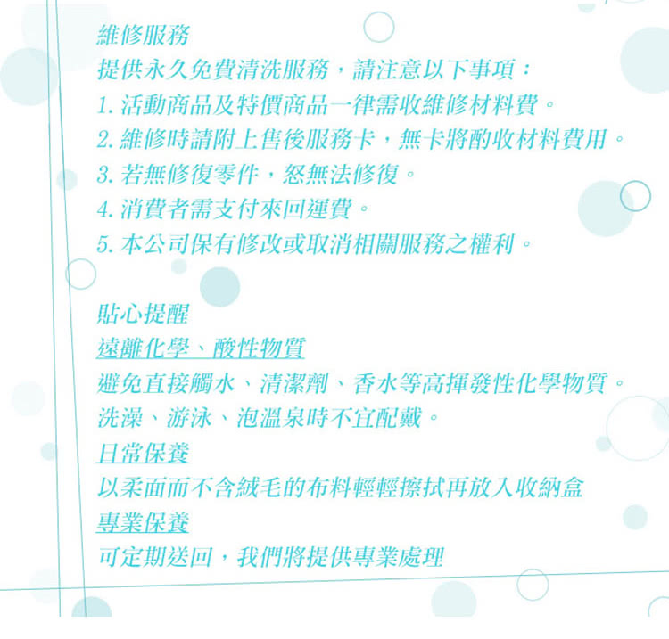 自購買日起提供免費基本保養清洗,其他修補需視商品損毀狀況酌收材料費用。