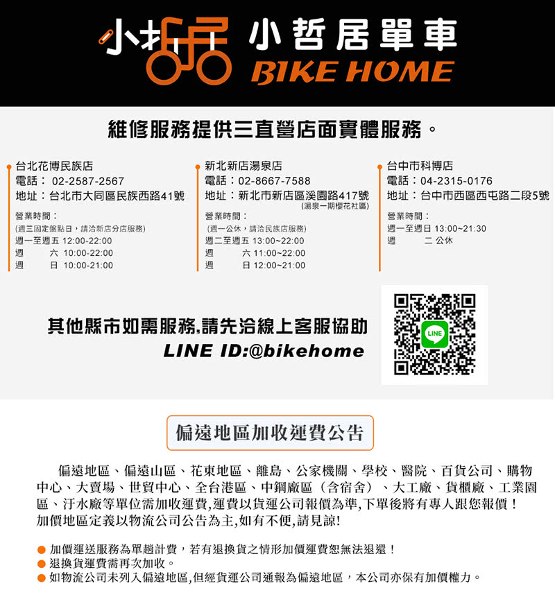 購買後需至太平洋自行車官網登錄會員以及車籍 ‧車架-2年:保固期間內,經認定為製造、材料或設計上的問題,太平洋自行車將提供免費修復或部品更換,但運費需由車主負擔。 ‧通用性零組件-1年:僅限於前叉、座墊、座桿、變速把手、前後變速器、大齒盤組、曲柄、主軸、前後花鼓、飛輪、車手、車手立管、前後剎車夾器、剎車把手、踏板、前後土除組、前後貨架組、軸承、連桿及連桿連結螺絲等。 ‧不提供免費保固之部件詳見原廠說明,無論是否人為因素造成,均不提供免費保固,須收取零件費用及工資。 ‧其餘詳盡保固內容依原廠說明。