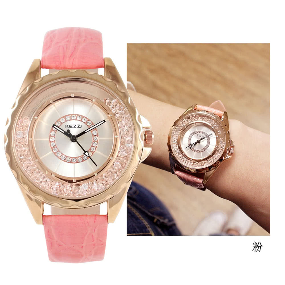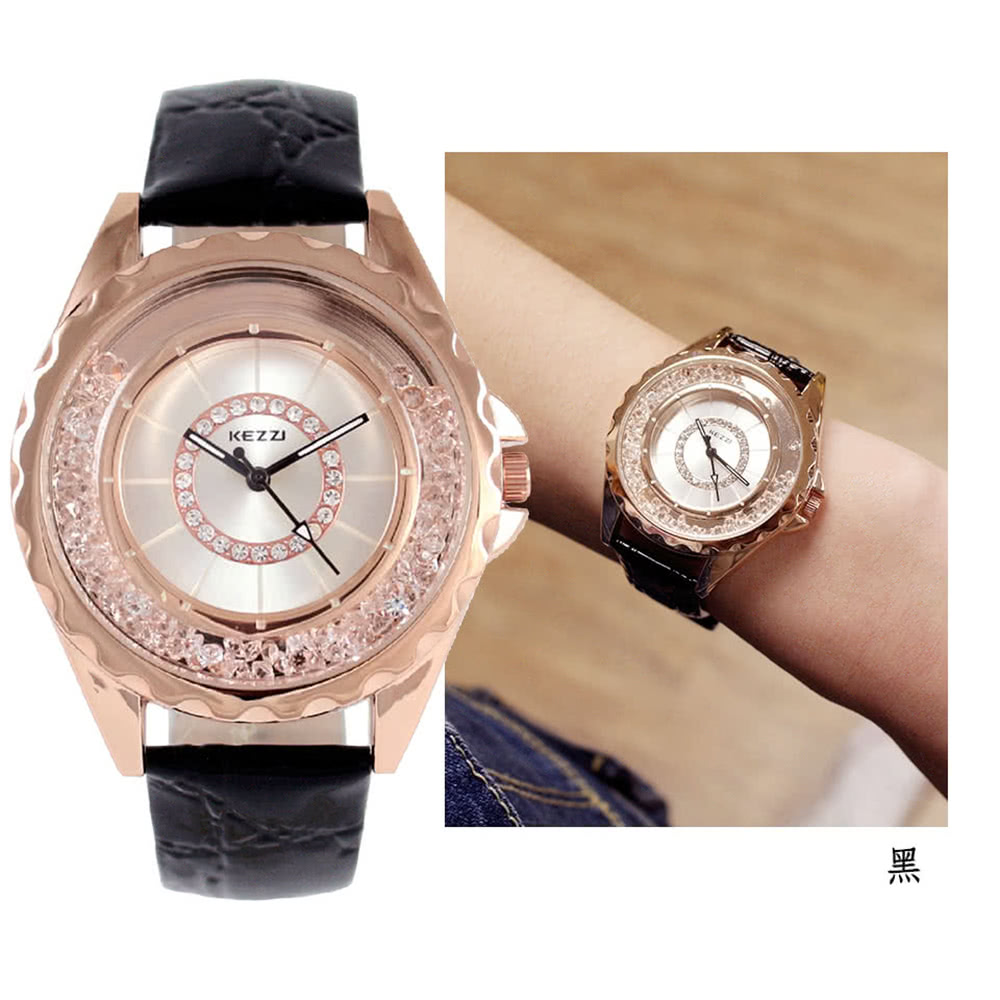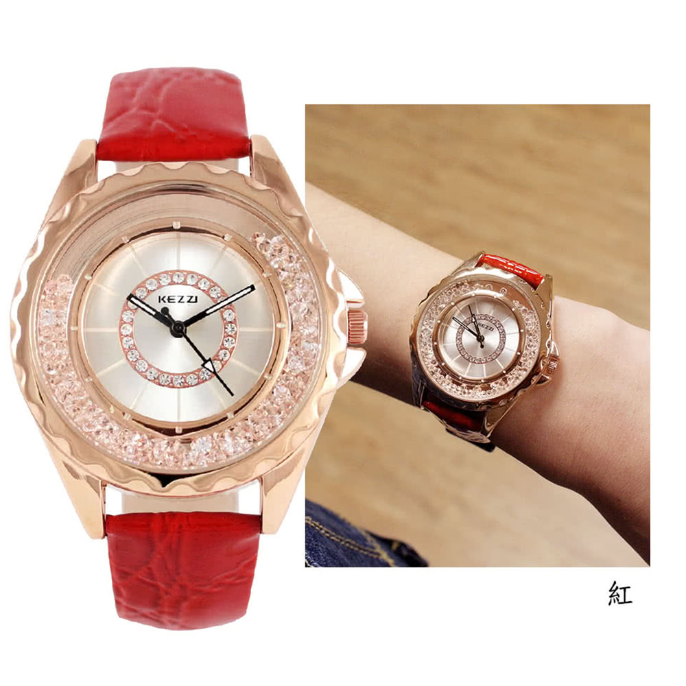 【微笑安安】香港品牌KEZZI*雙圈滑動晶鑽皮帶女錶(共4色)