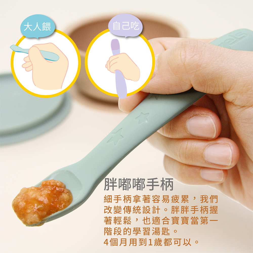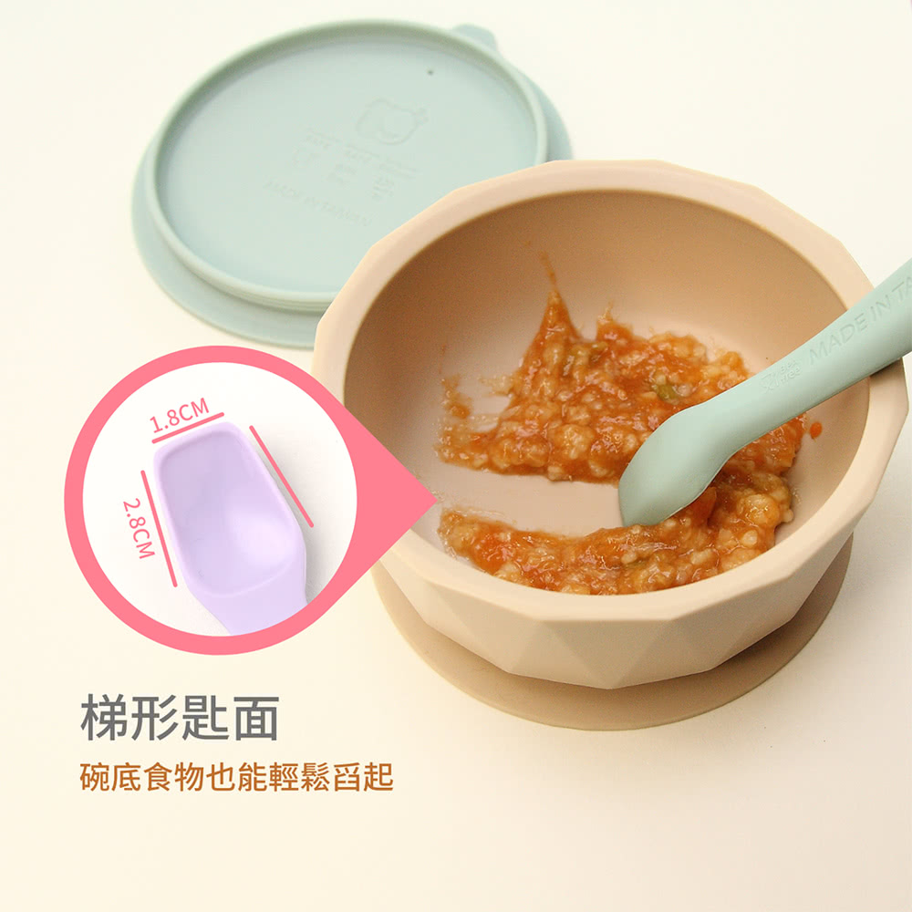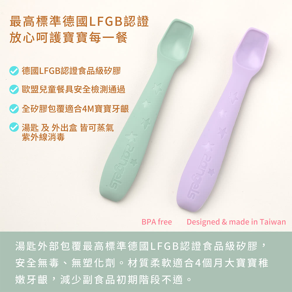 符合歐盟EN14372兒童餐具標準經世界公認嚴格的德國LFGB認證合格柔軟矽膠湯匙 適合寶寶稚嫩牙齦底部平整設計不易翻滾掉落
