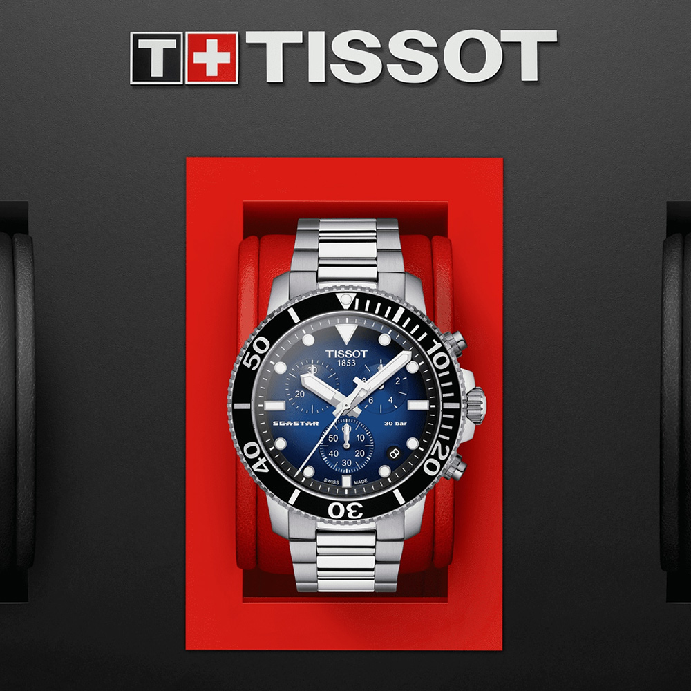 Tissot Seastar 1000石英計時碼表是潛水員的首選腕錶 防水高達至30巴 ( 300米/ 1000英尺),夜光指針與時標顯示 單向旋轉設計,有了這款手錶,你可以大膽冒險進入深處,它不會讓你失望。