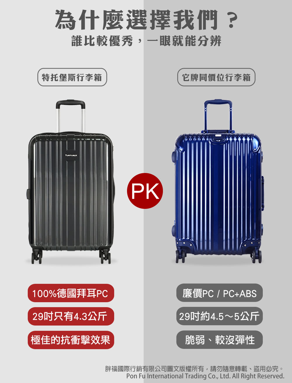 ◆我們堅決不用回收料,一般市面上宣稱PC的產品,大多是使用大量回收料。其他廠牌標榜的100%PC也幾乎都含回收料,塑膠較易破損且可能含有毒成份危害人體,更是託運損壞箱殼主因。