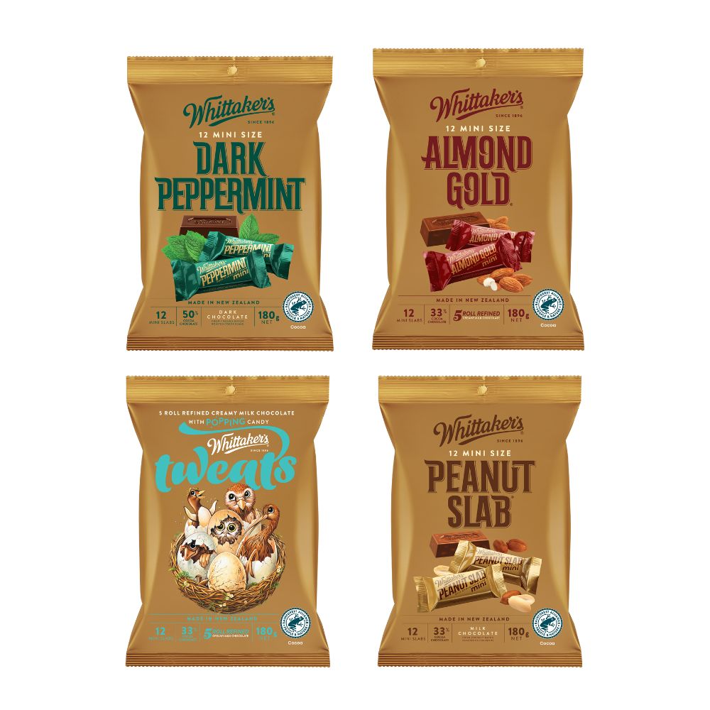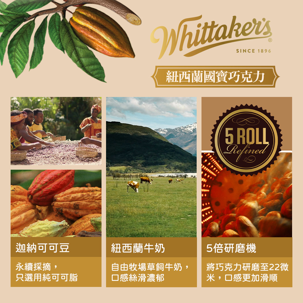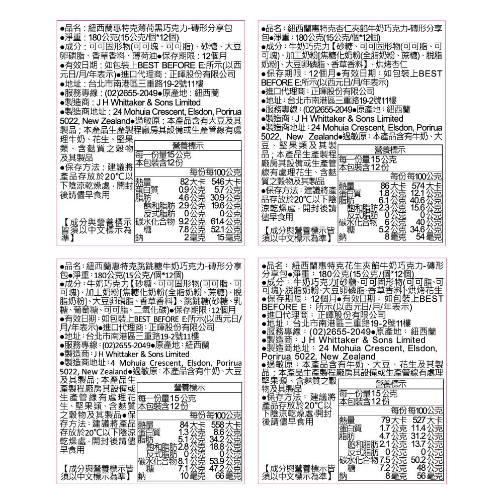 【紐西蘭Whittakers】巧克力磚形分享包180g(跳跳糖牛奶/花生夾餡牛奶/杏仁夾餡牛奶/薄荷黑巧)