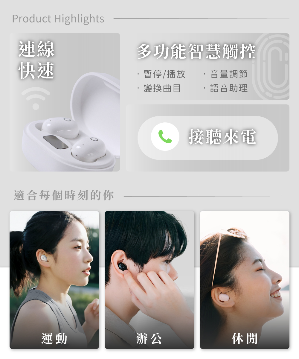 1.多功能智慧觸控: 免去按鍵束縛,輕觸一下暫停/播放,右邊輕觸兩下下一首/左邊上一首,右邊輕觸三下調大聲/左邊小聲,長按2秒叫出siri